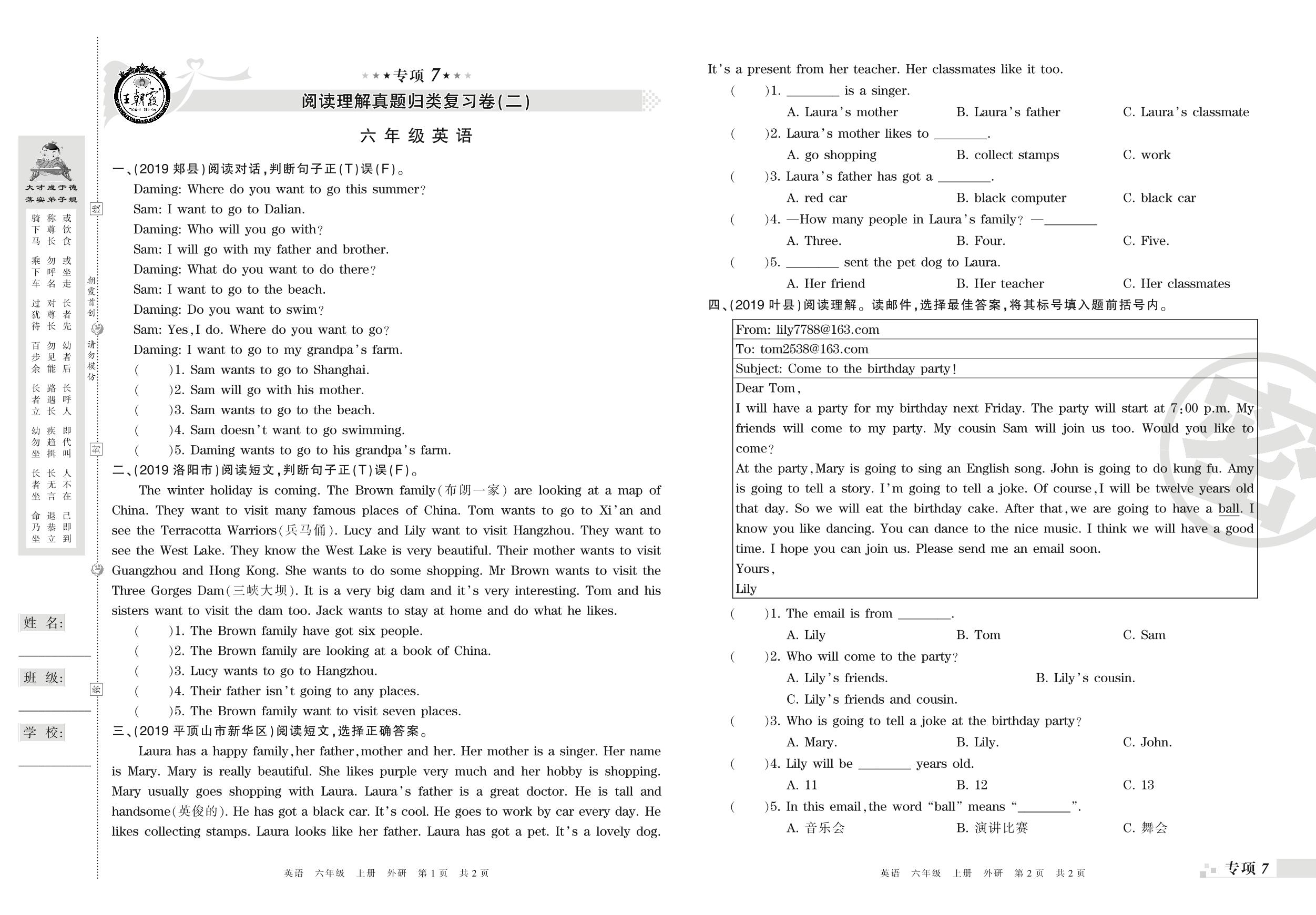 王朝霞期末专项卷——阅读理解、写作真题归类复习六年级上册英语(外研版)_R210807164525【0】