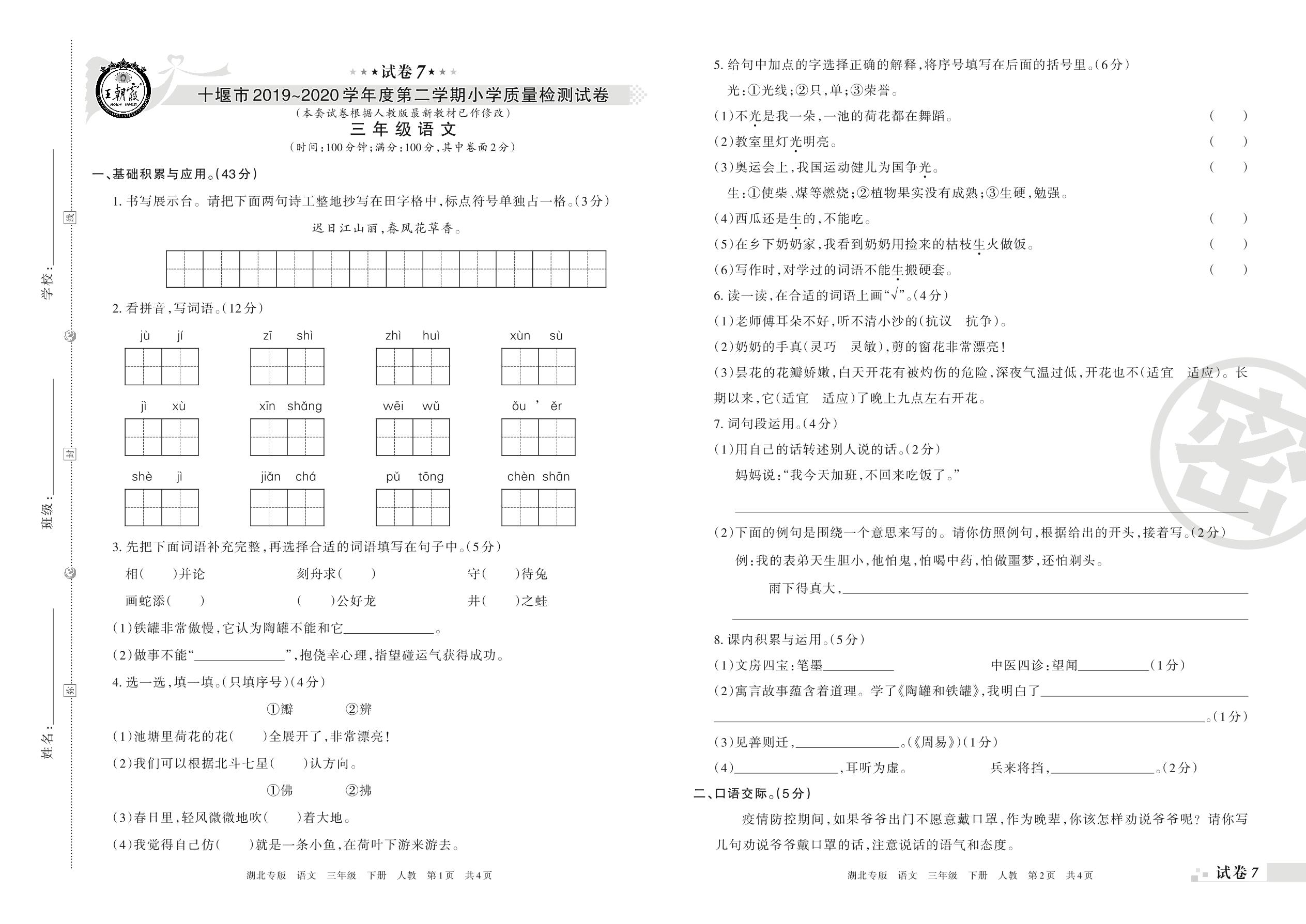 2019-2020学年第二学期十堰市三年级语文试卷(人教版)【7】
