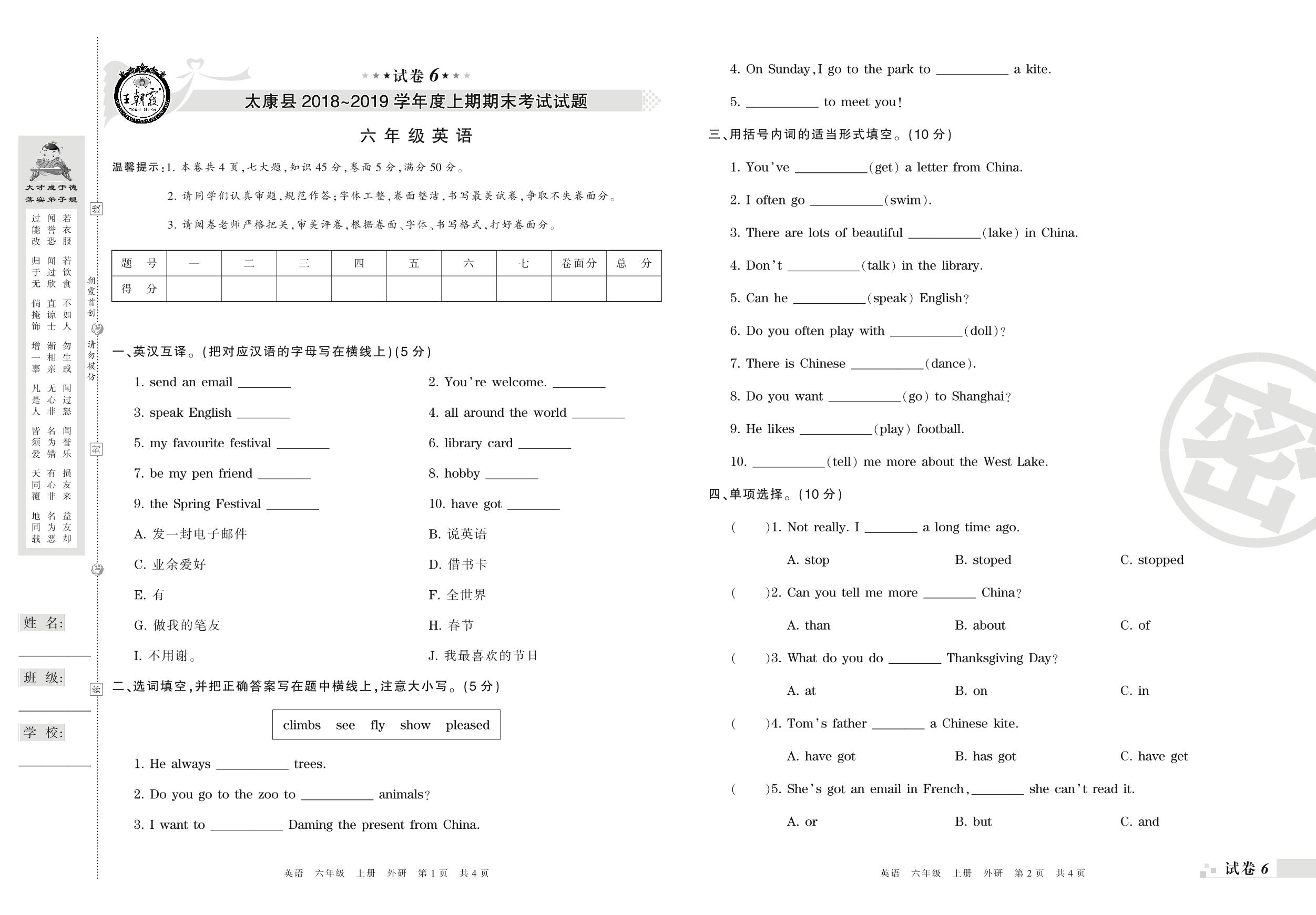 2018-2019学年第一学期周口市太康县六年级英语试卷(外研版)【6】
