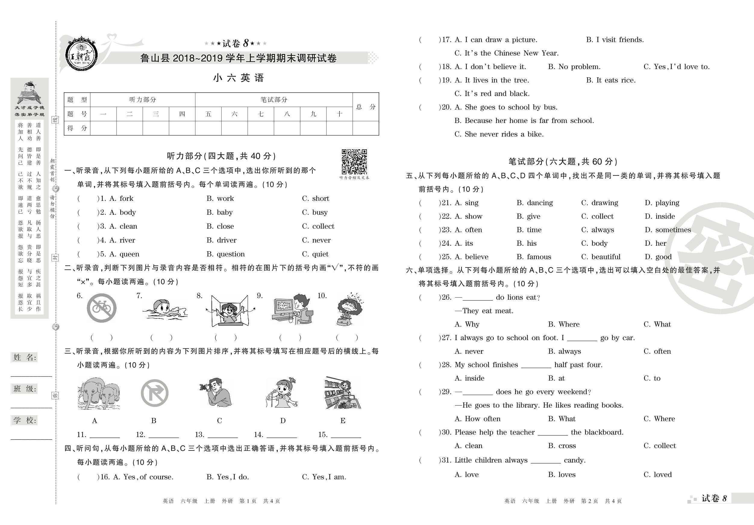 2018-2019学年第一学期平顶山市鲁山县六年级英语试卷(外研版)【8】