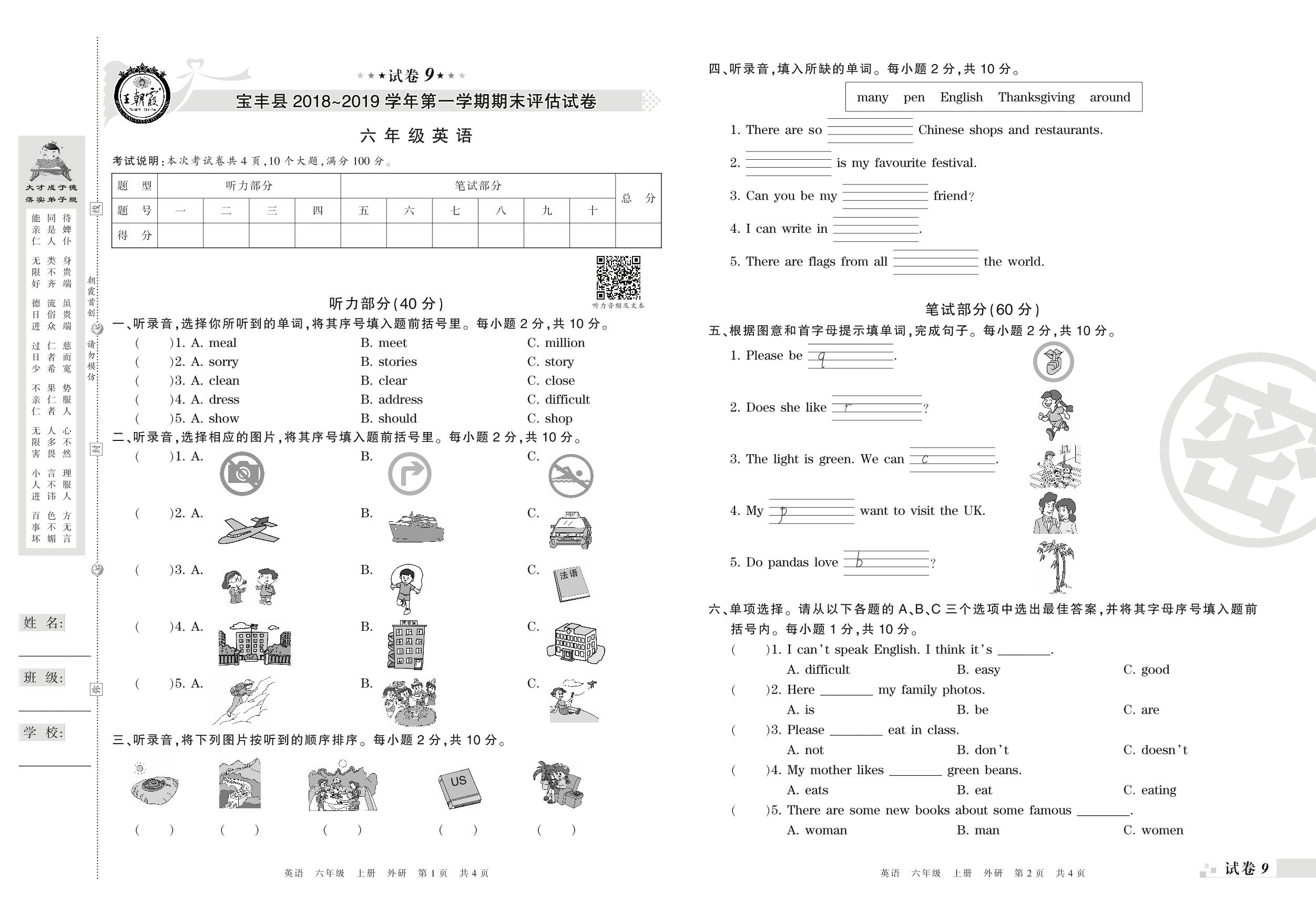 2018-2019学年第一学期平顶山市宝丰县六年级英语试卷(外研版)【9】