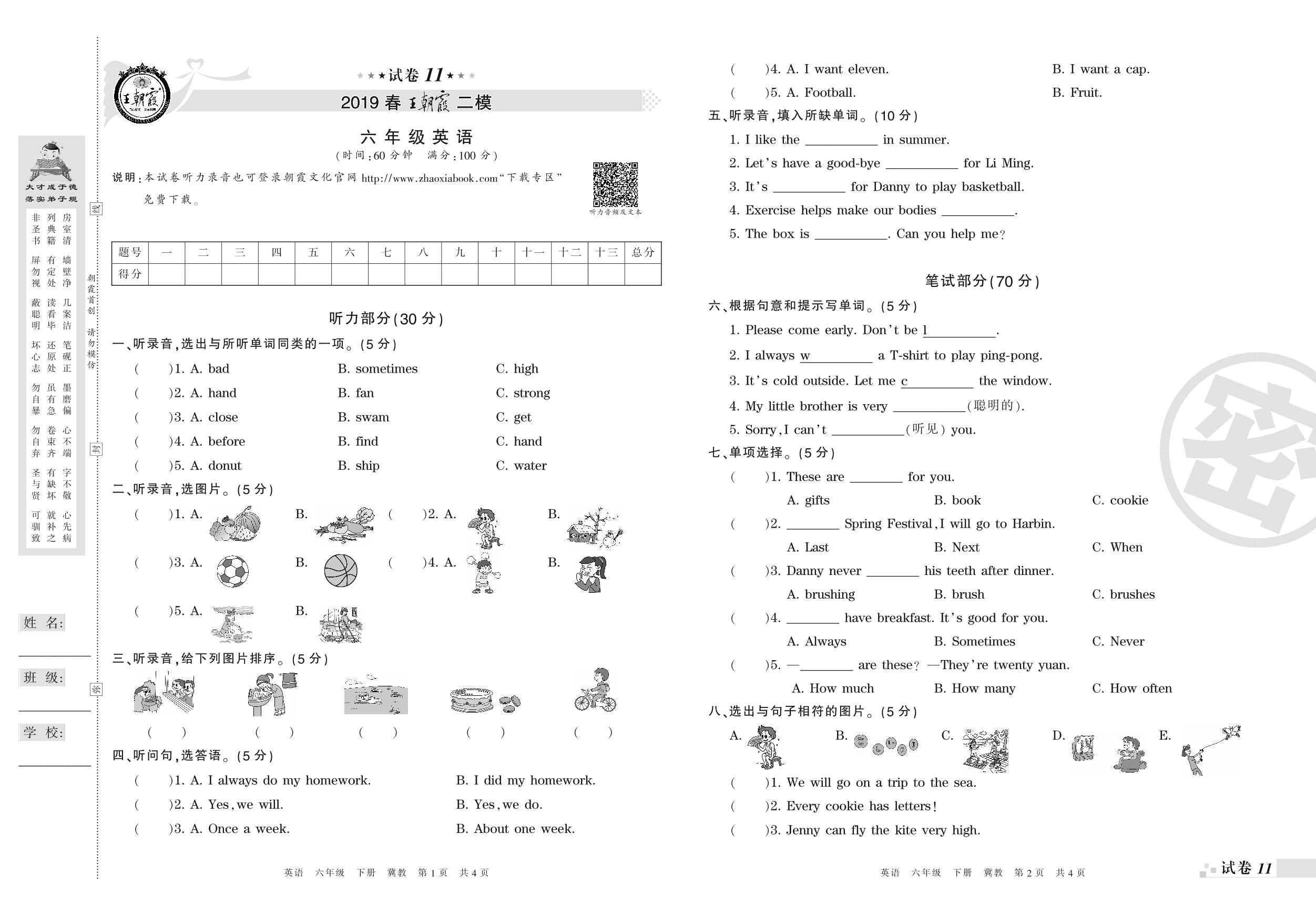 王朝霞期末模拟卷六年级下册英语(冀教版)_R210807164601【11】