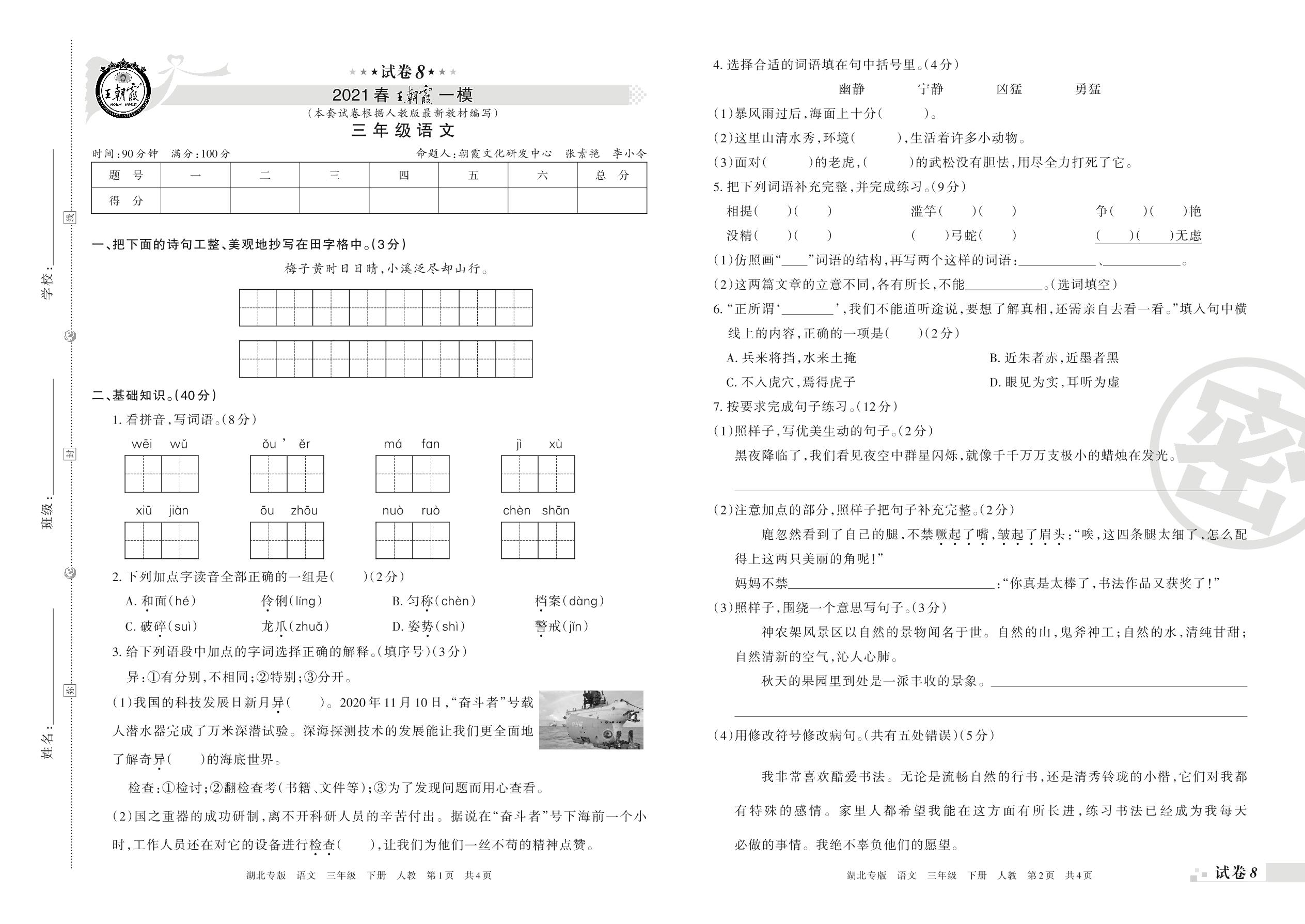 王朝霞期末模拟卷三年级下册语文(人教版)_R21080184221【8】