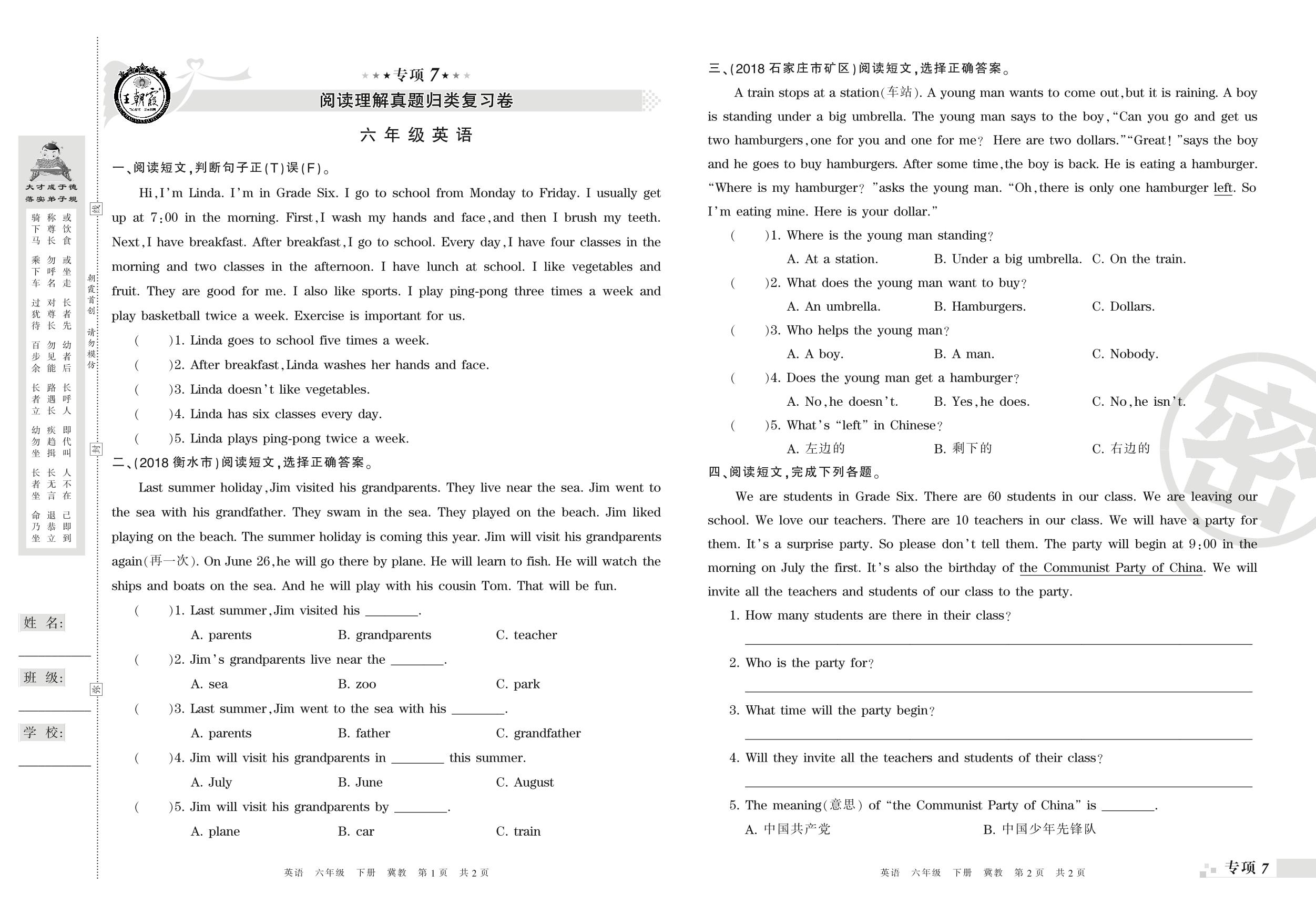 王朝霞期末专项卷——阅读理解、补全短文与写作真题归类复习卷六年级下册英语(冀教版)_R210807164615【0】
