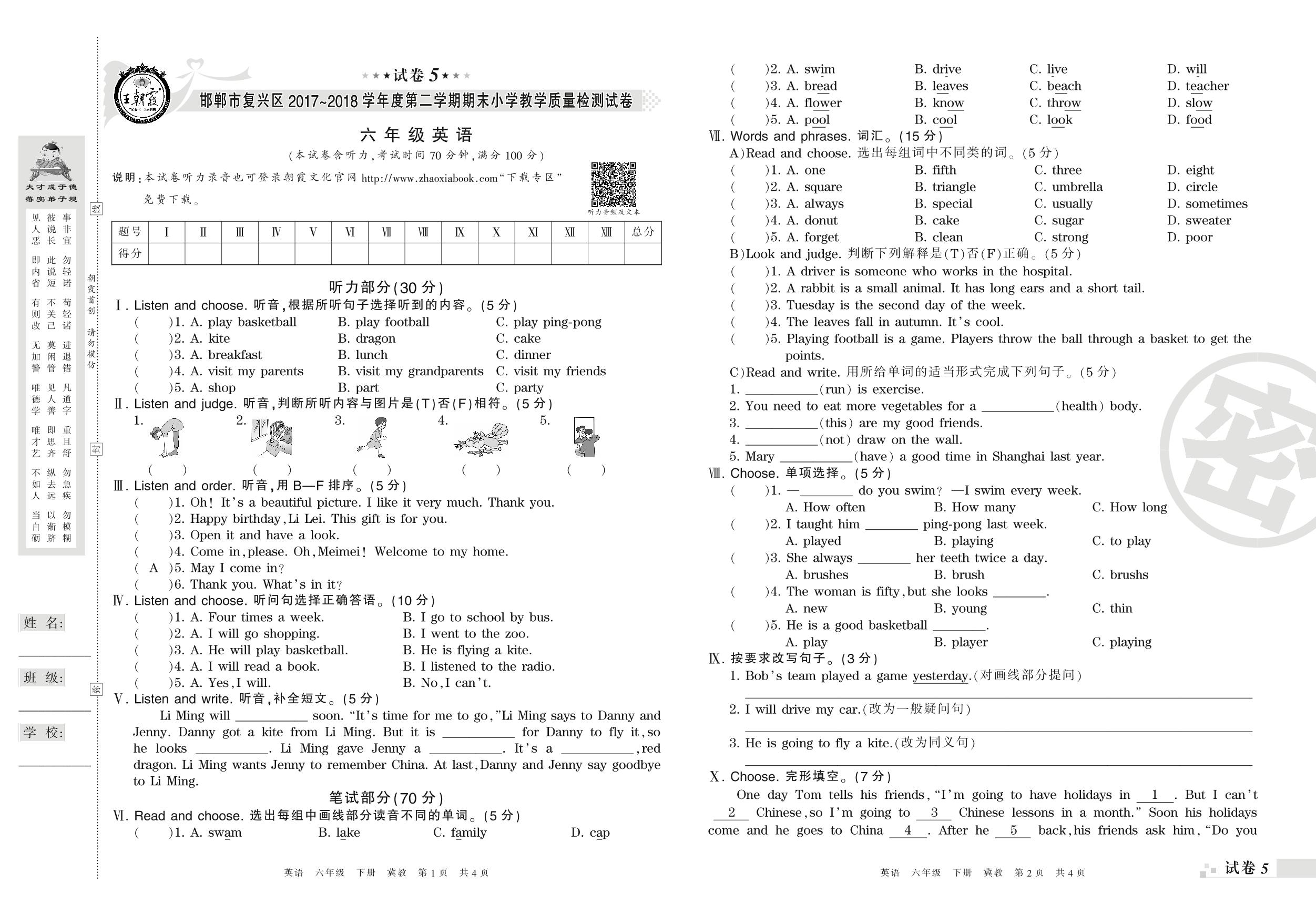 2017-2018学年第二学期邯郸市复兴区六年级英语试卷(冀教版)【5】