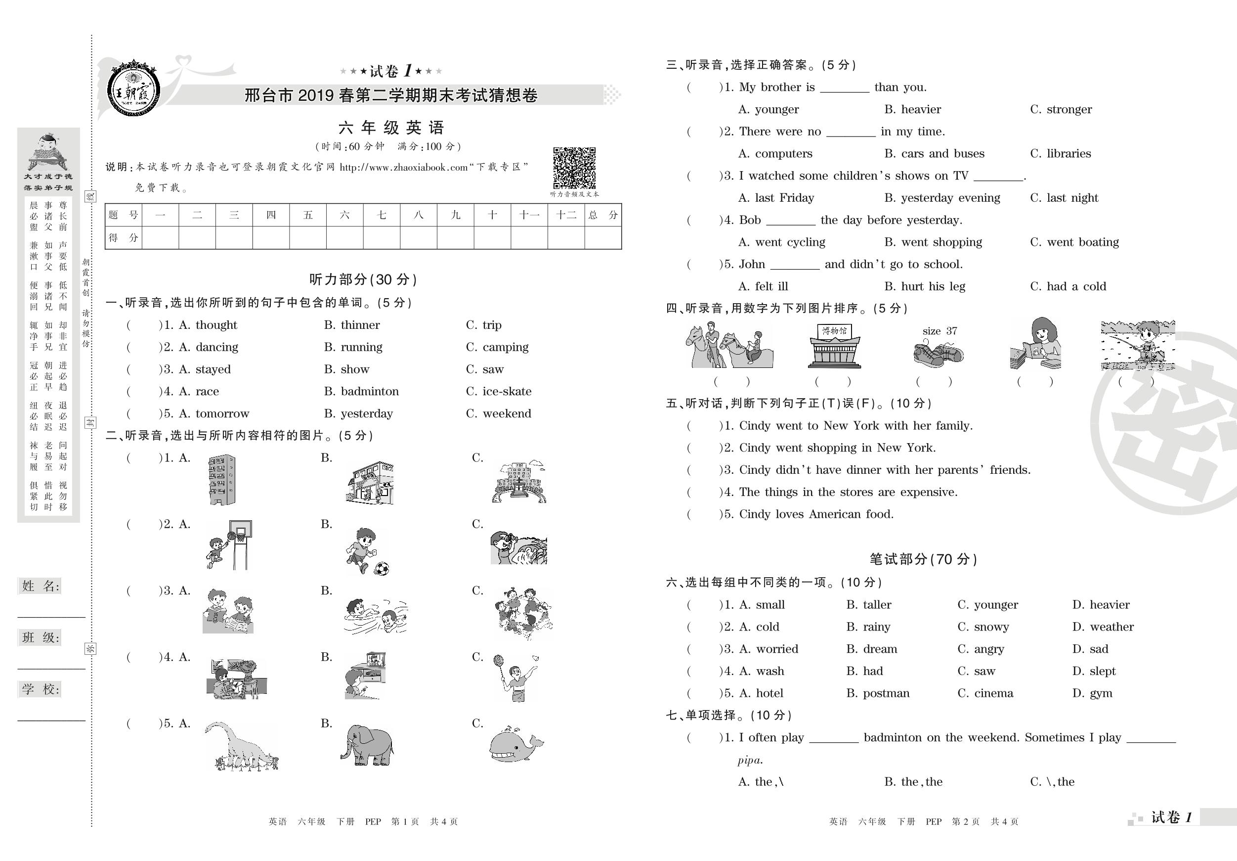2018-2019学年第二学期邢台市猜想卷六年级英语试卷(PEP版)【1】