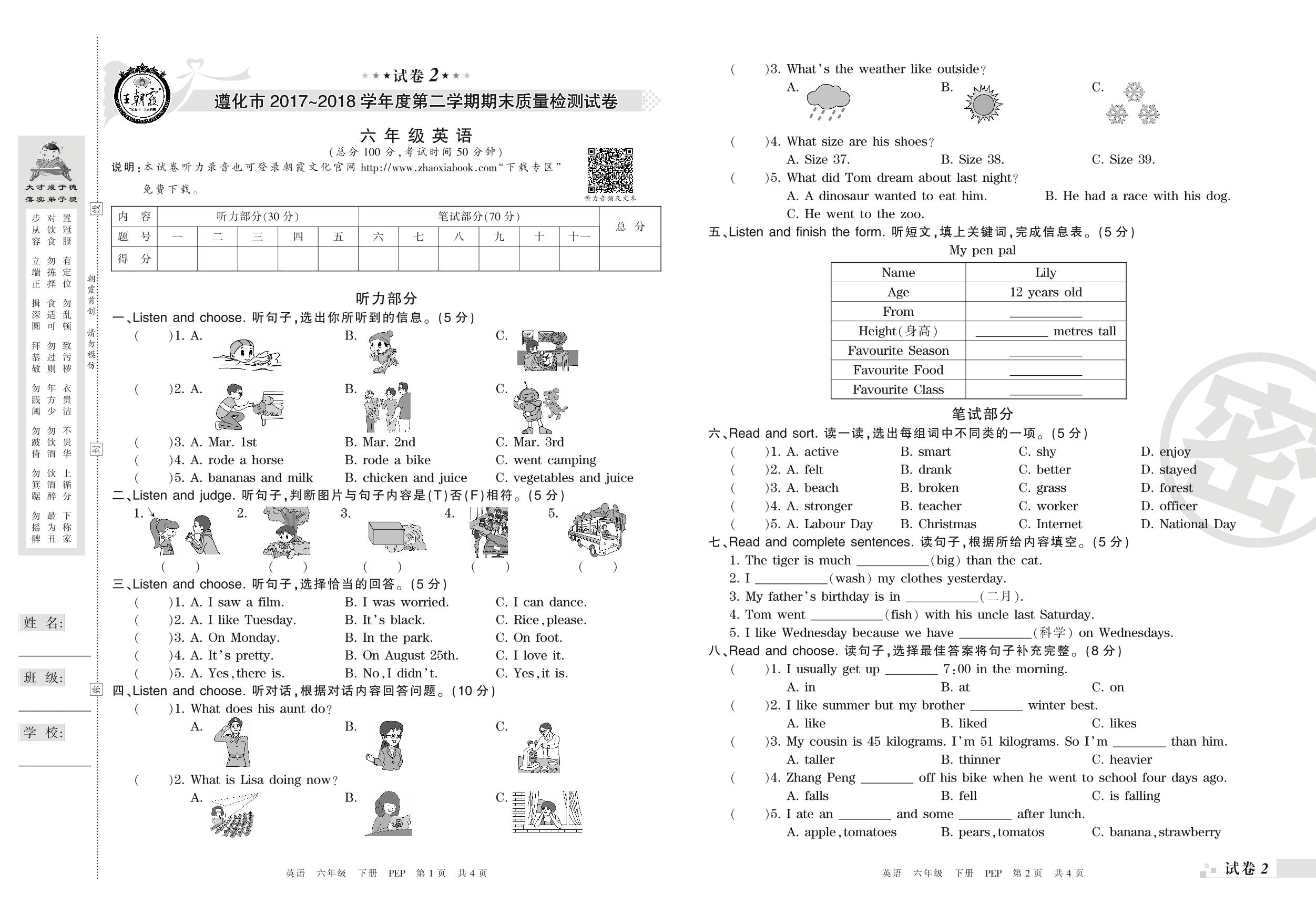 2017-2018学年第二学期遵化市六年级英语试卷(PEP版)【2】
