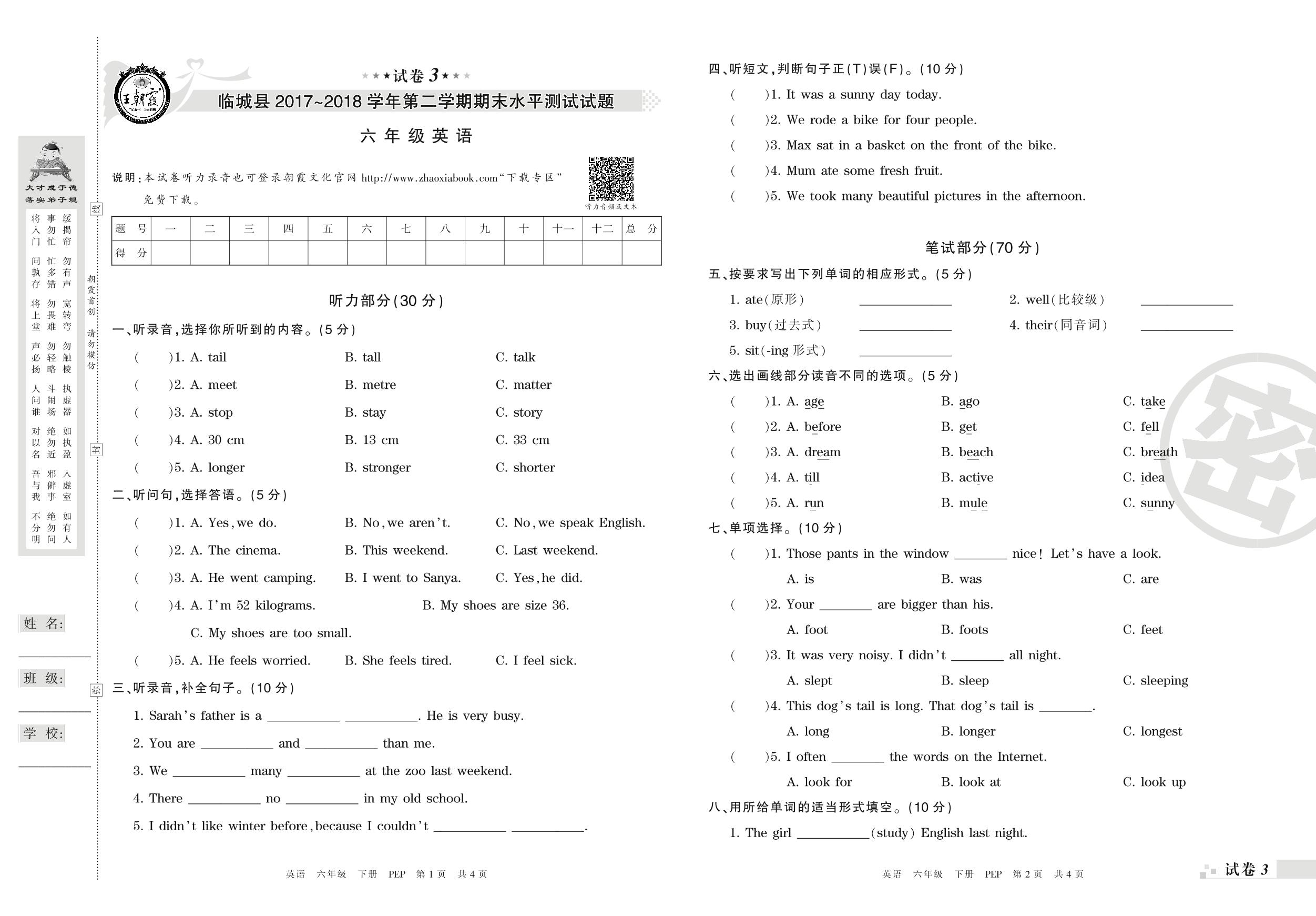 2017-2018学年第二学期邢台市临城县六年级英语试卷(PEP版)【3】