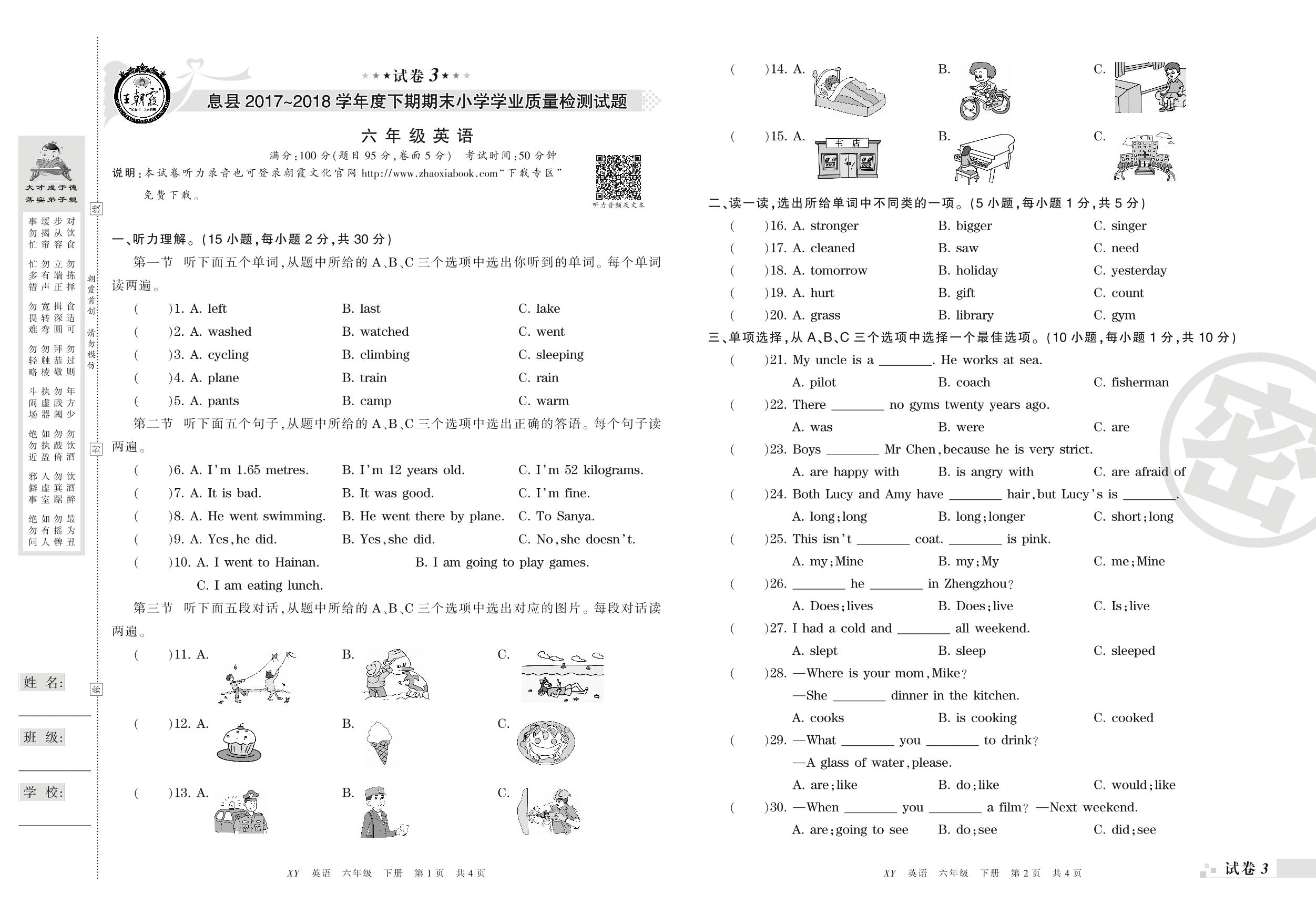 2017-2018学年第二学期信阳市息县六年级英语试卷(PEP版)【3】
