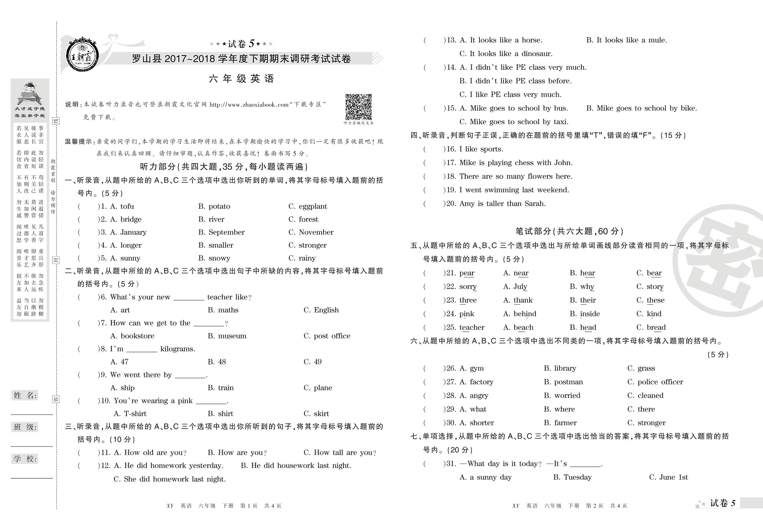 2017-2018学年第二学期信阳市罗山县六年级英语试卷(PEP版)【5】