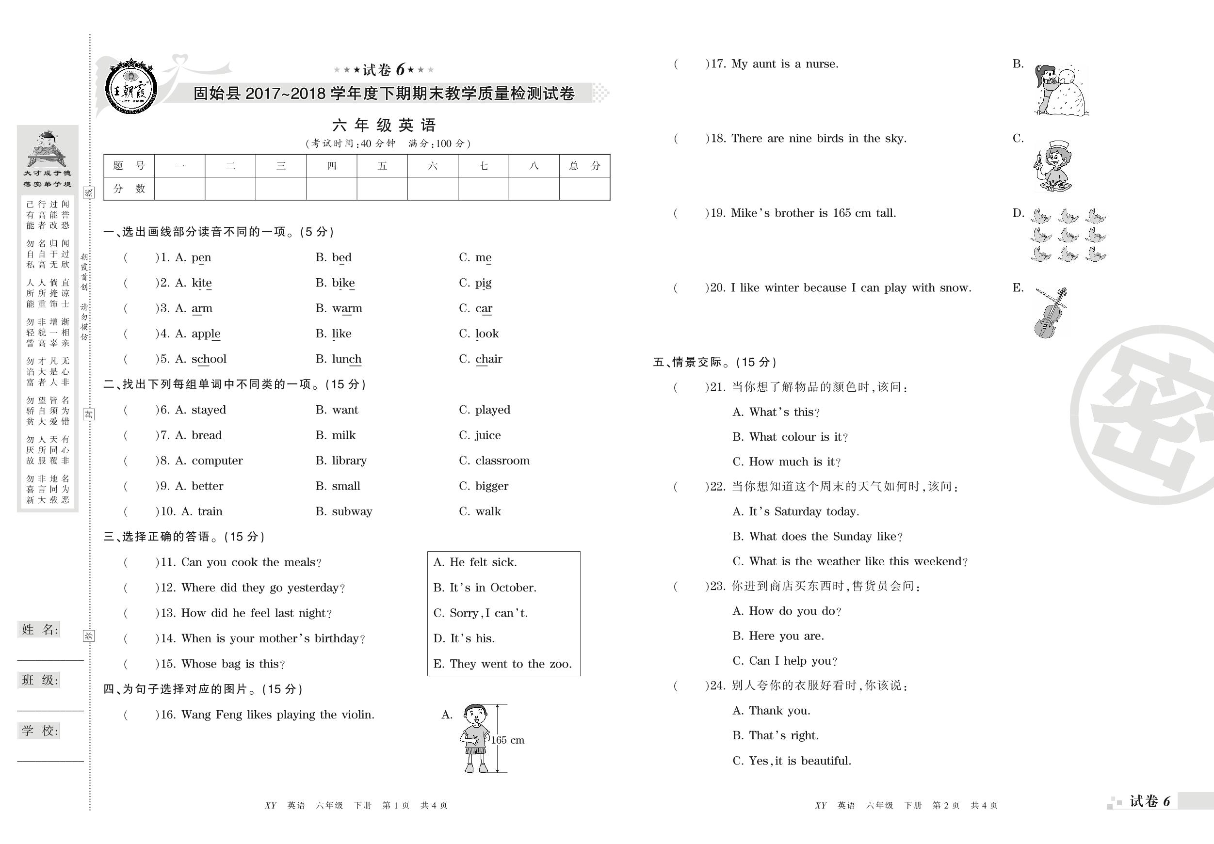 2017-2018学年第二学期信阳市固始县六年级英语试卷(PEP版)【6】