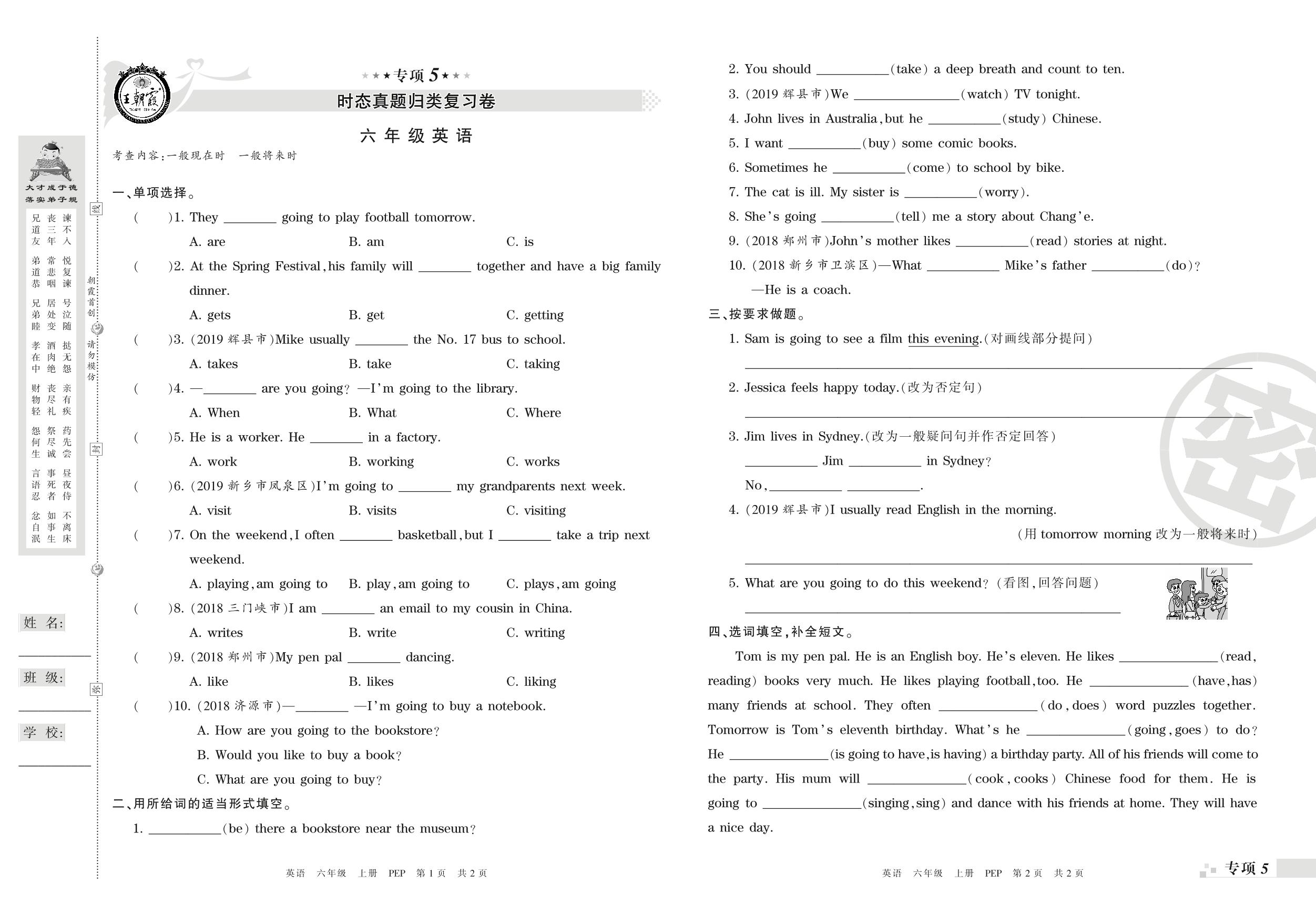 王朝霞期末专项卷——时态、情景交际真题归类复习六年级上册英语(PEP版)_R210807164926【0】