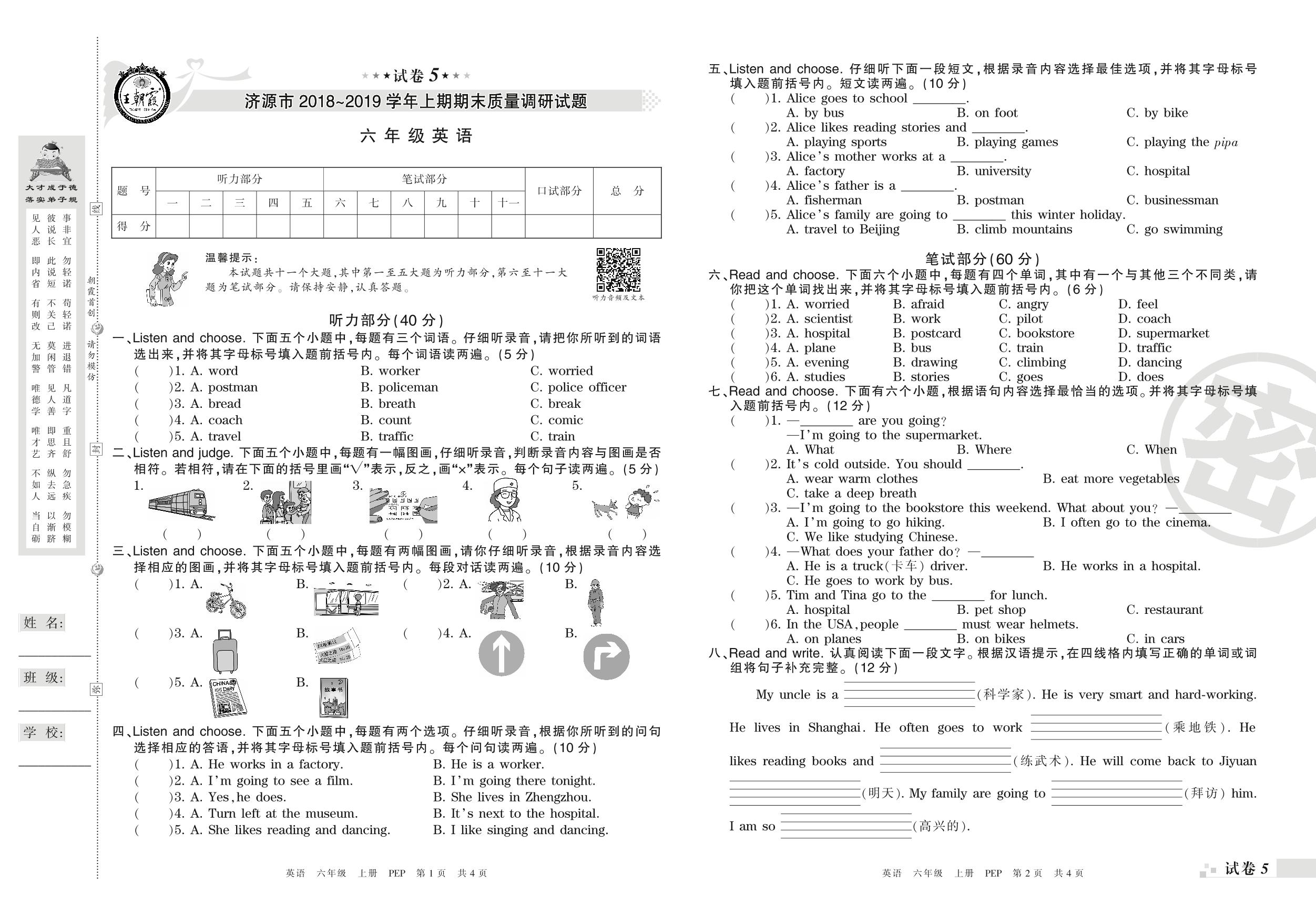 2018-2019学年第一学期济源市六年级英语试卷(PEP版)【5】