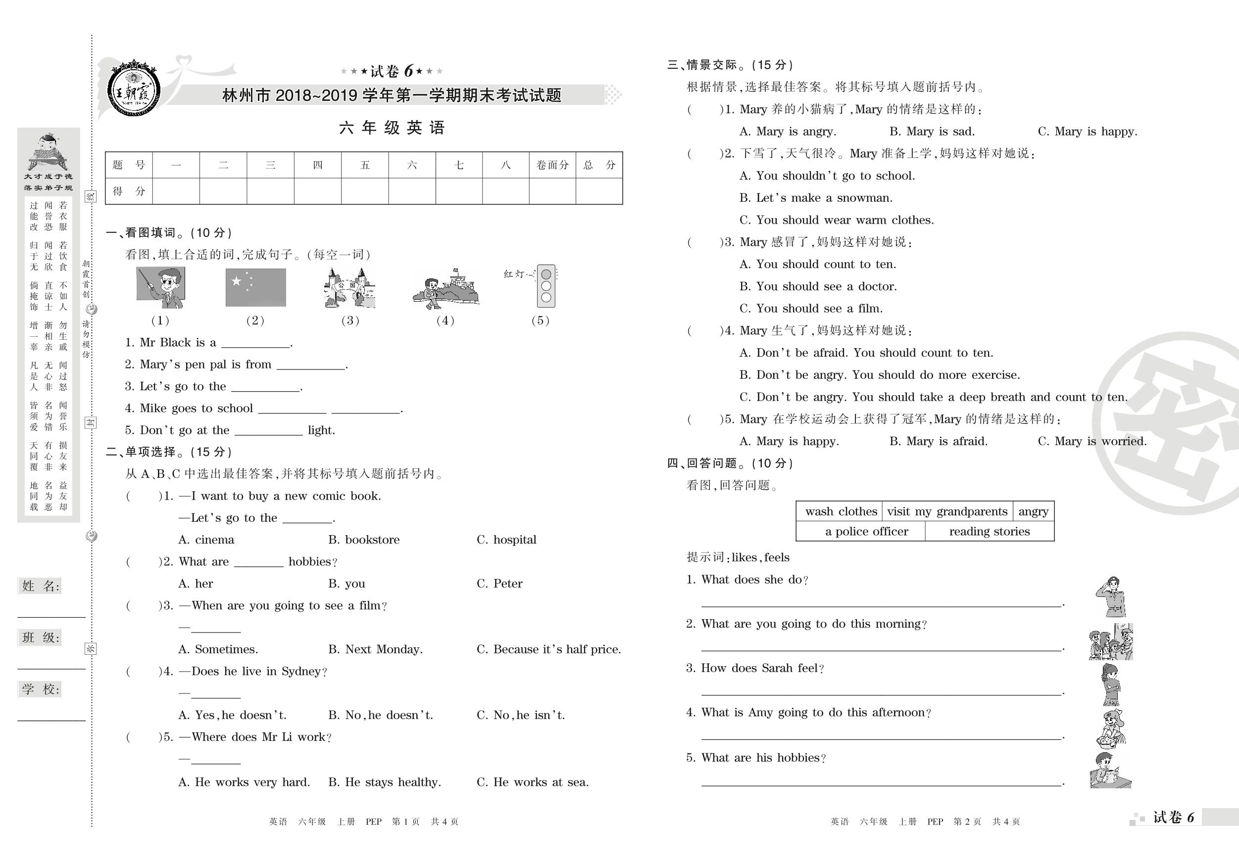 2018-2019学年第一学期林州市六年级英语试卷(PEP版)【6】