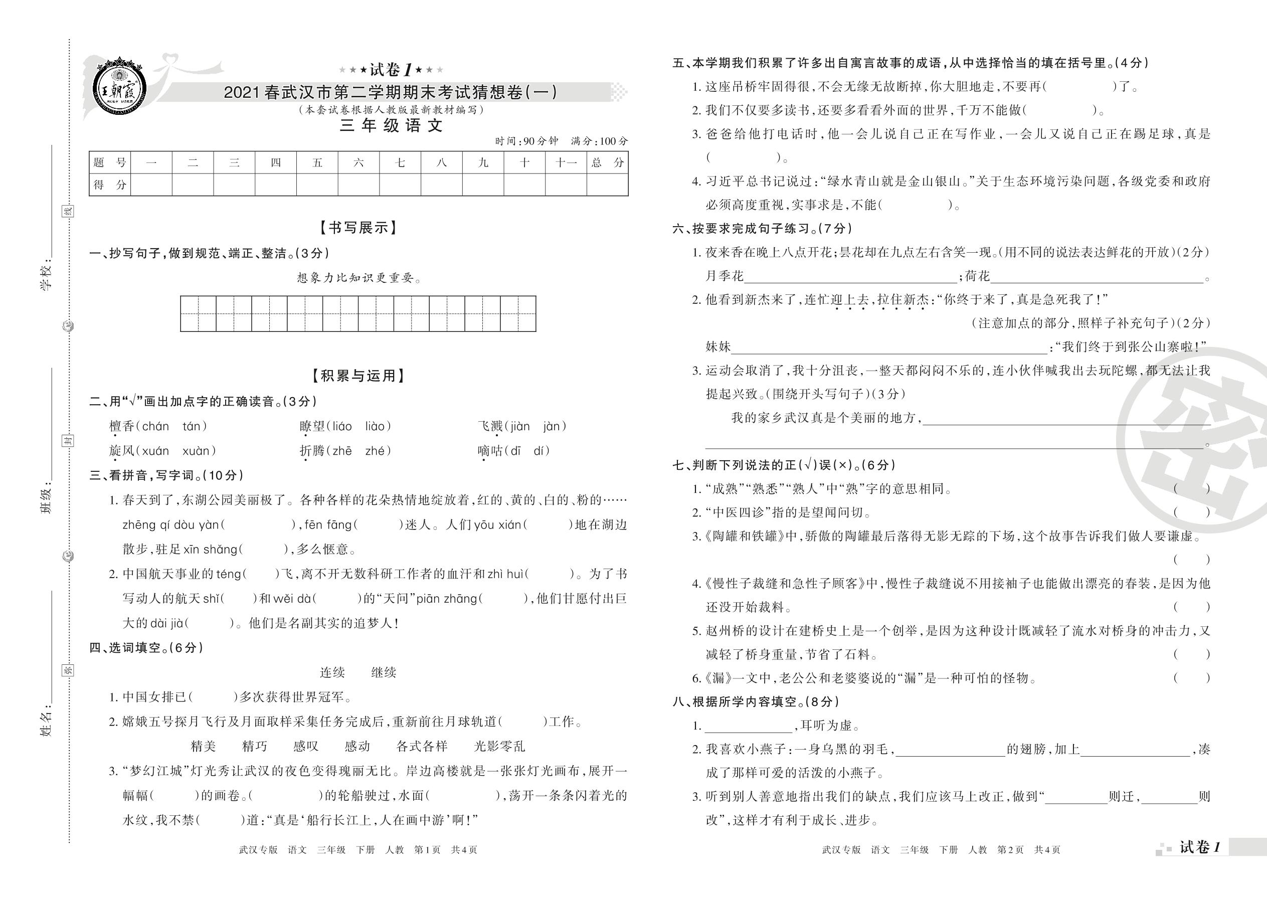 王朝霞期末猜想卷三年级下册语文(人教版)【1】