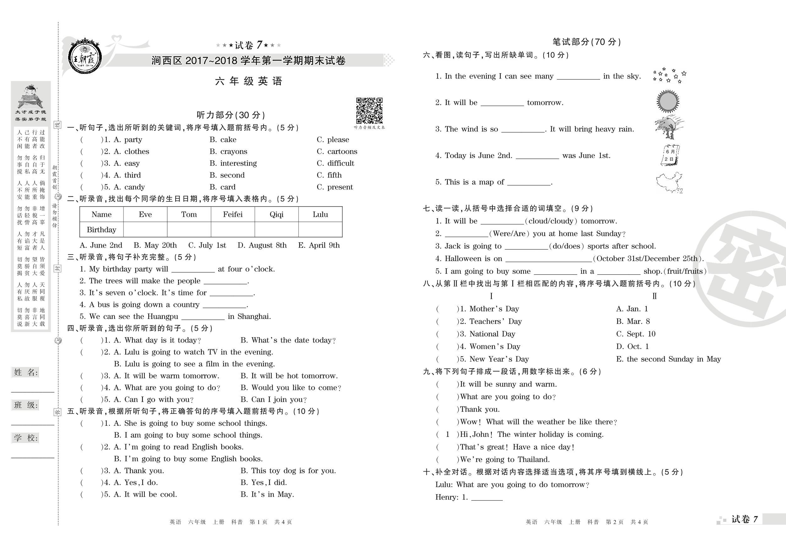 2017-2018学年第一学期洛阳市涧西区六年级英语试卷(科普版)【7】