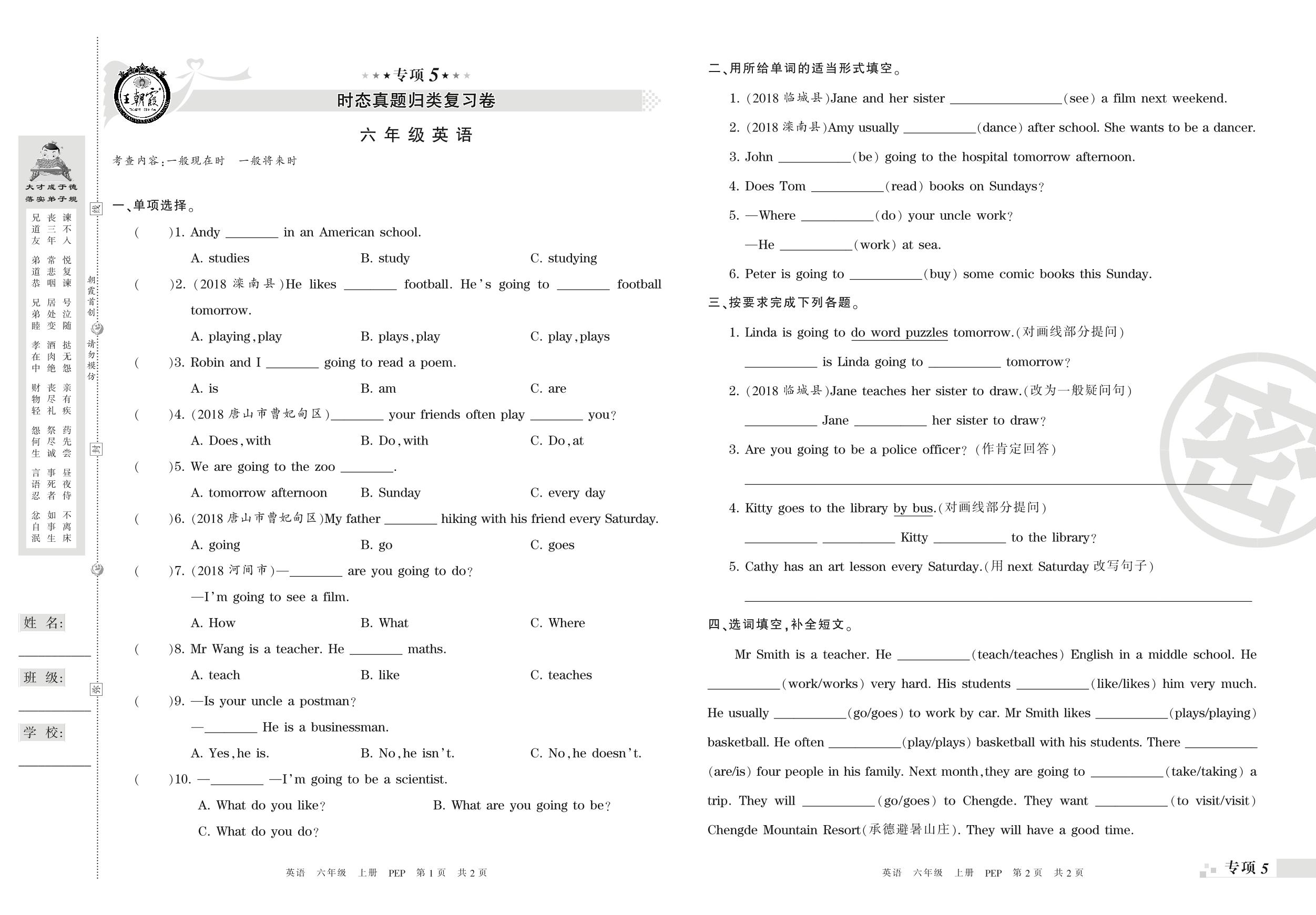 王朝霞期末专项卷——时态、情景交际真题归类复习六年级上册英语(PEP版)_R210807165129【0】