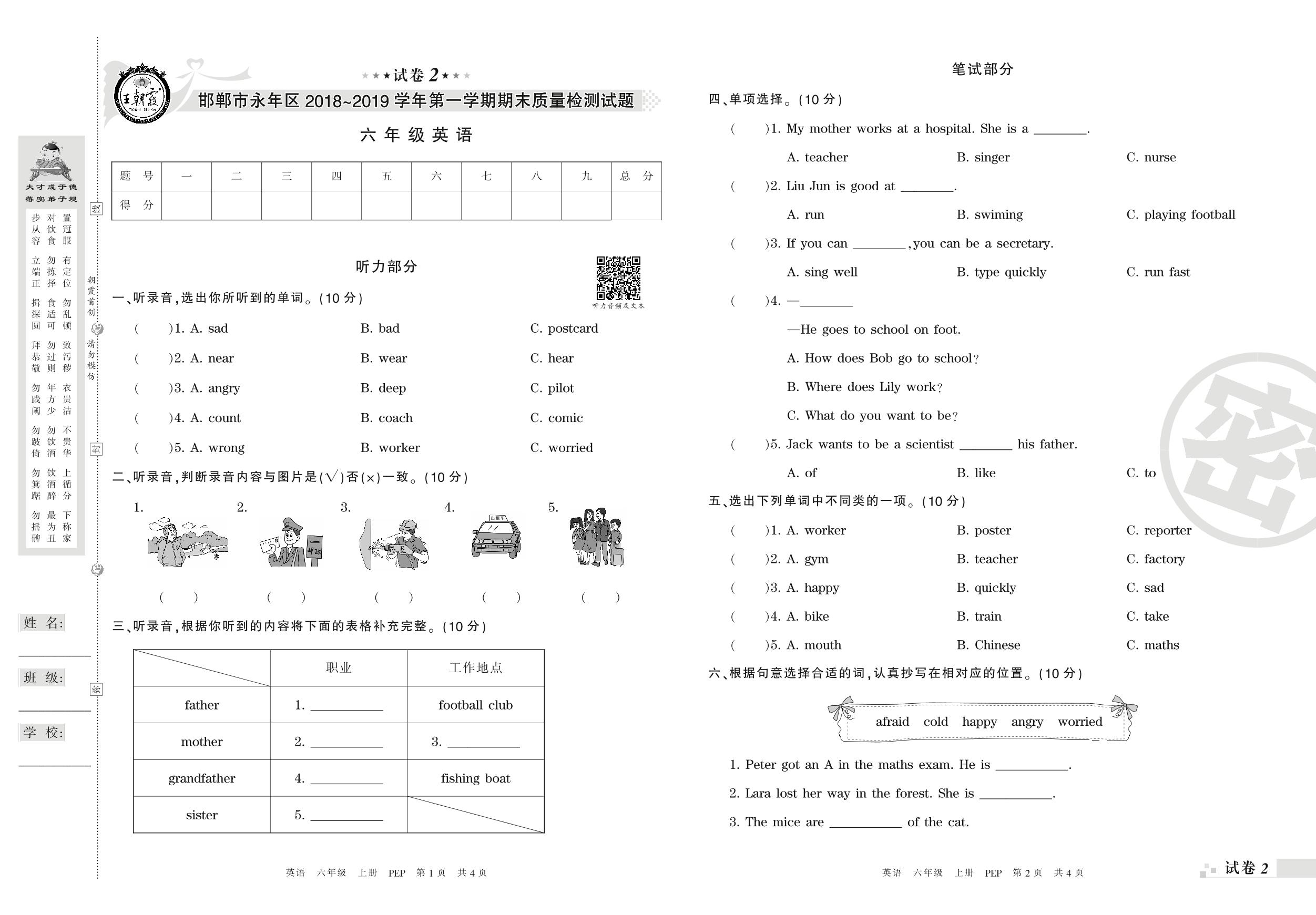 2018-2019学年第一学期邯郸市永年区六年级英语试卷(PEP版)【2】