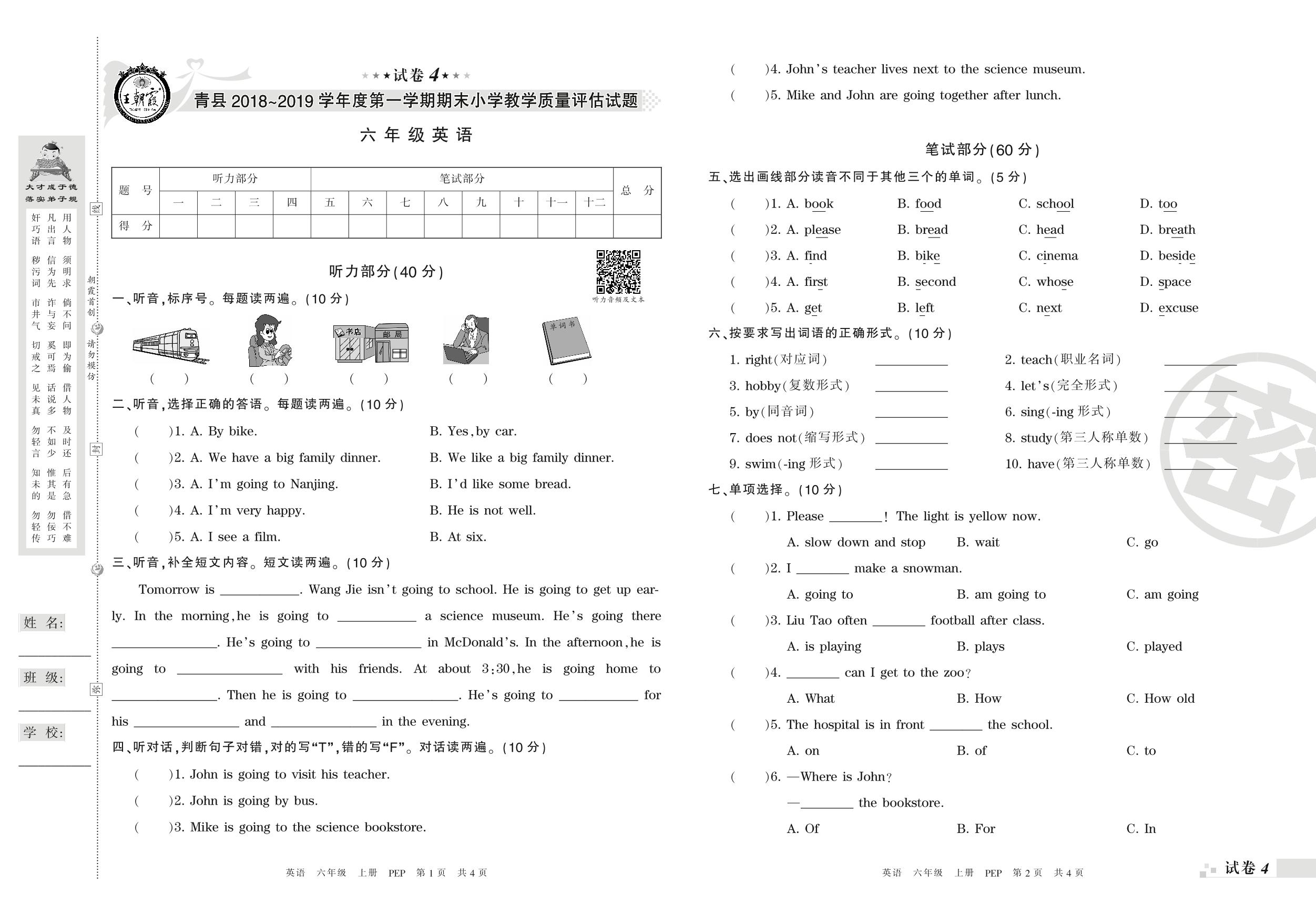 2018-2019学年第一学期沧州市青县六年级英语试卷(PEP版)【4】