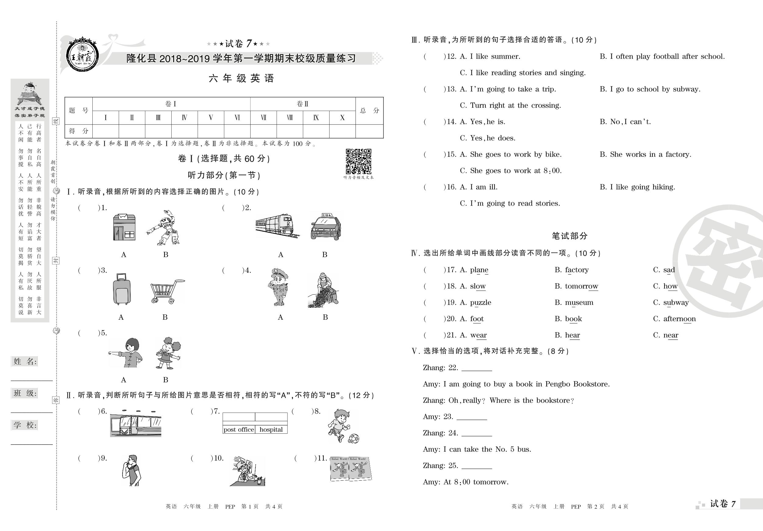 2018-2019学年第一学期承德市隆化县六年级英语试卷(PEP版)【7】