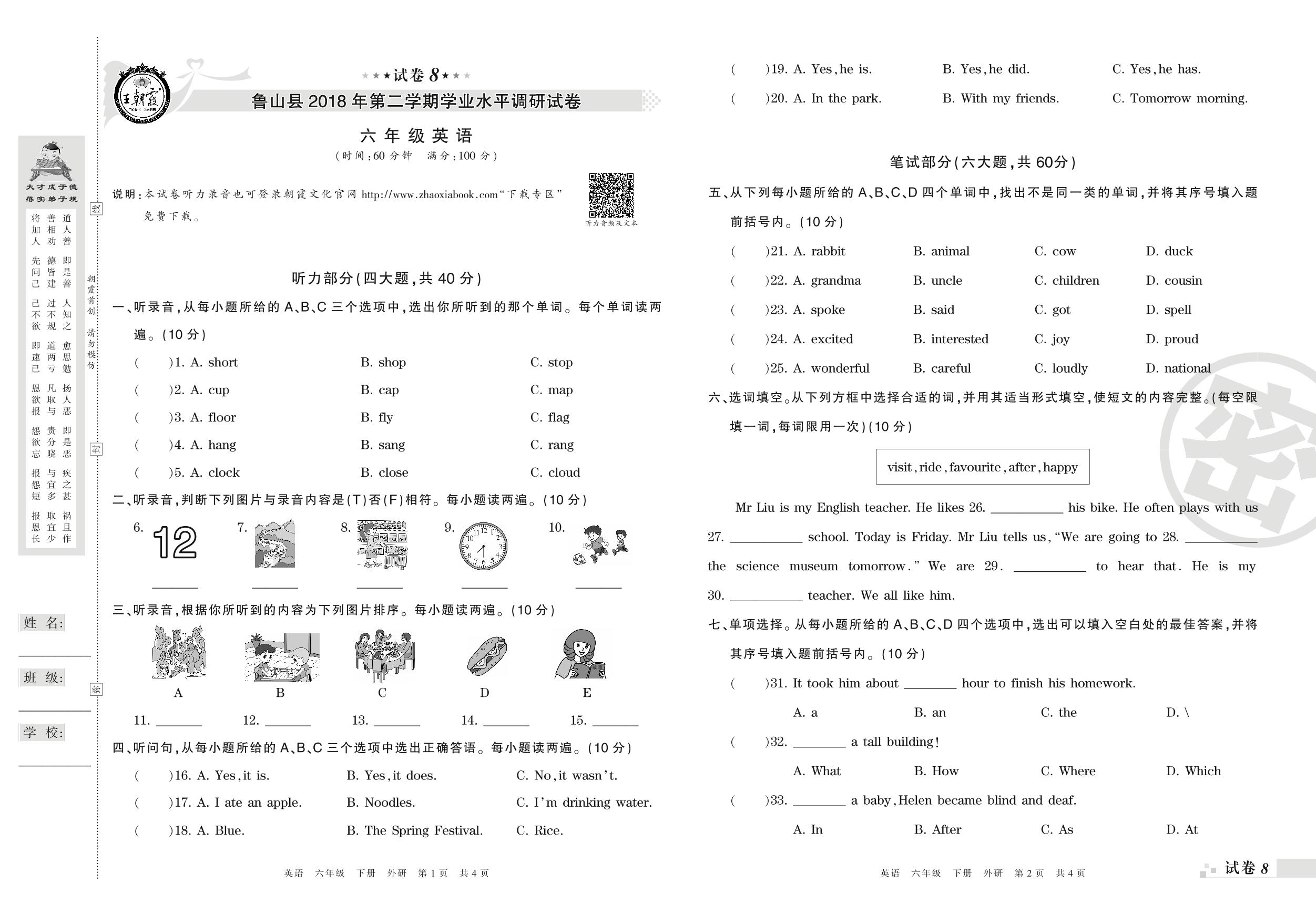 2017-2018学年第二学期平顶山市鲁山县六年级英语试卷(外研版)【8】