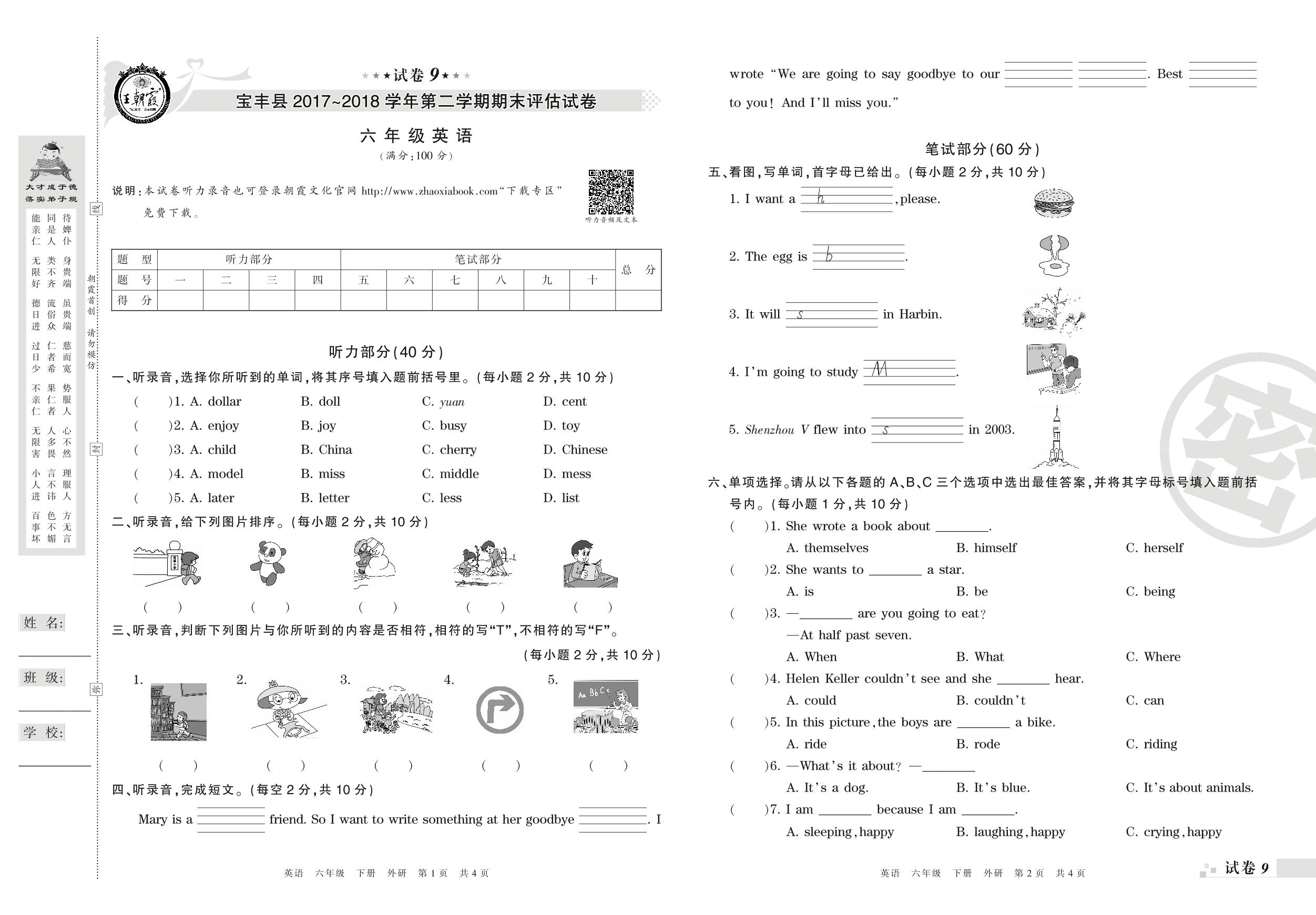 2017-2018学年第二学期平顶山市宝丰县六年级英语试卷(外研版)【9】