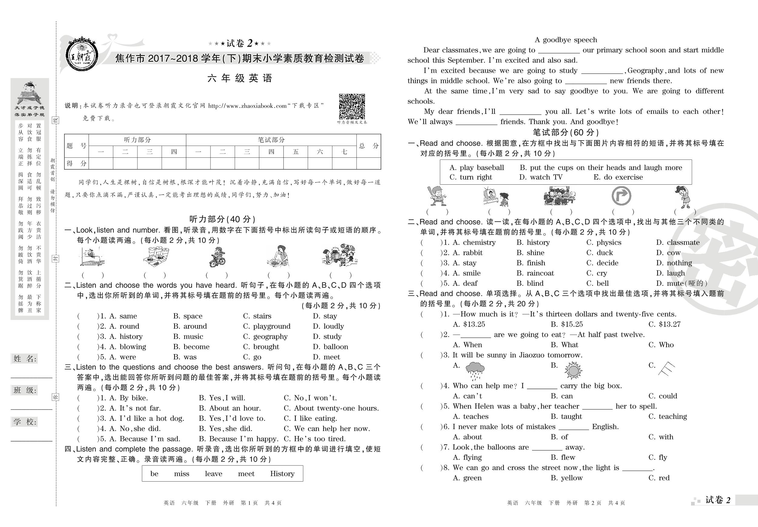 2017-2018学年第二学期焦作市六年级英语试卷(外研版)【2】