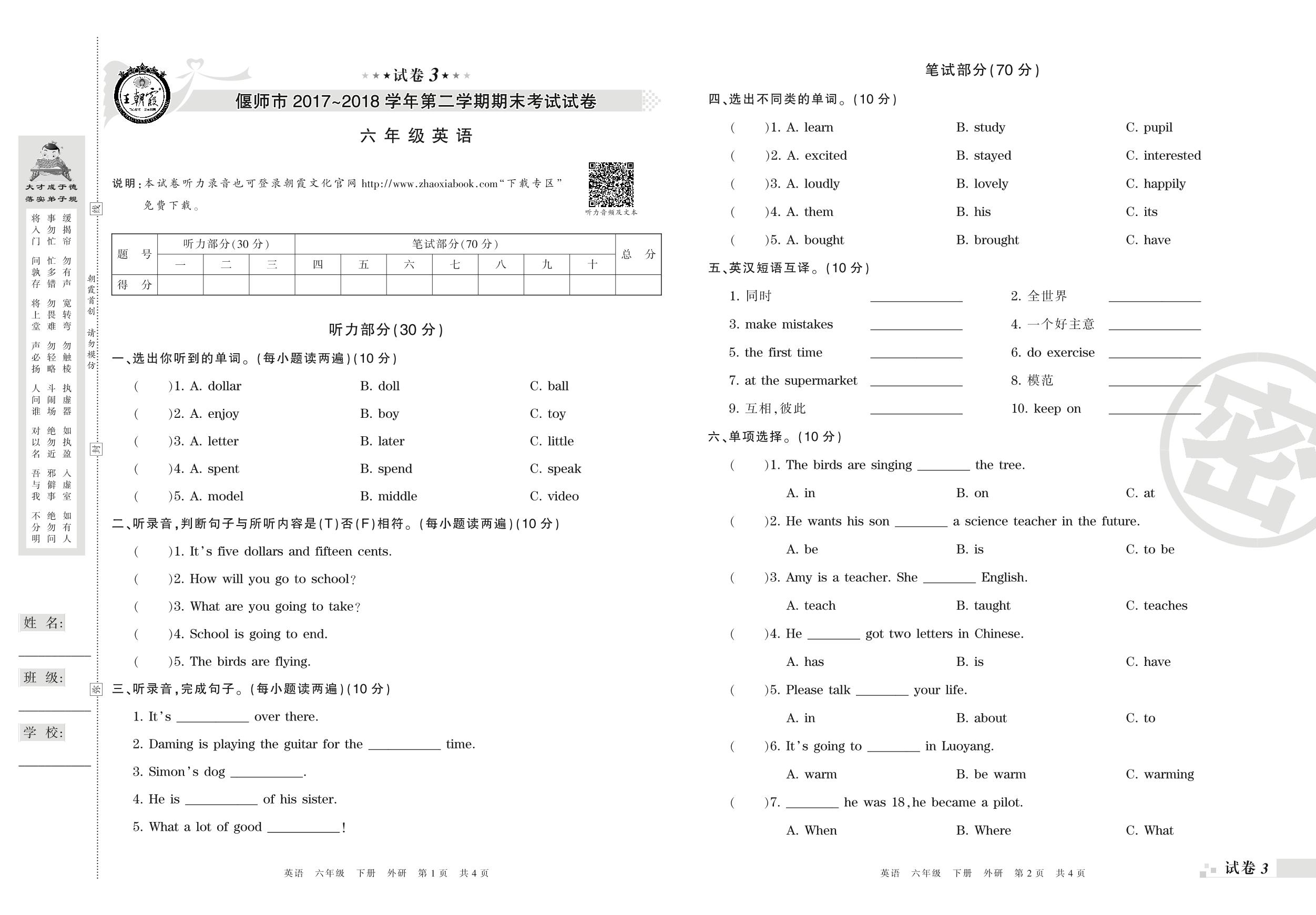 2017-2018学年第二学期偃师市六年级英语试卷(外研版)【3】