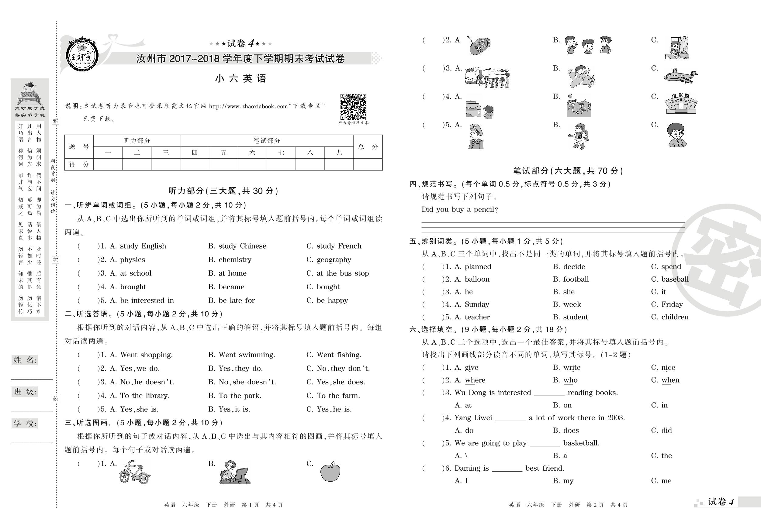 2017-2018学年第二学期汝州市六年级英语试卷(外研版)【4】