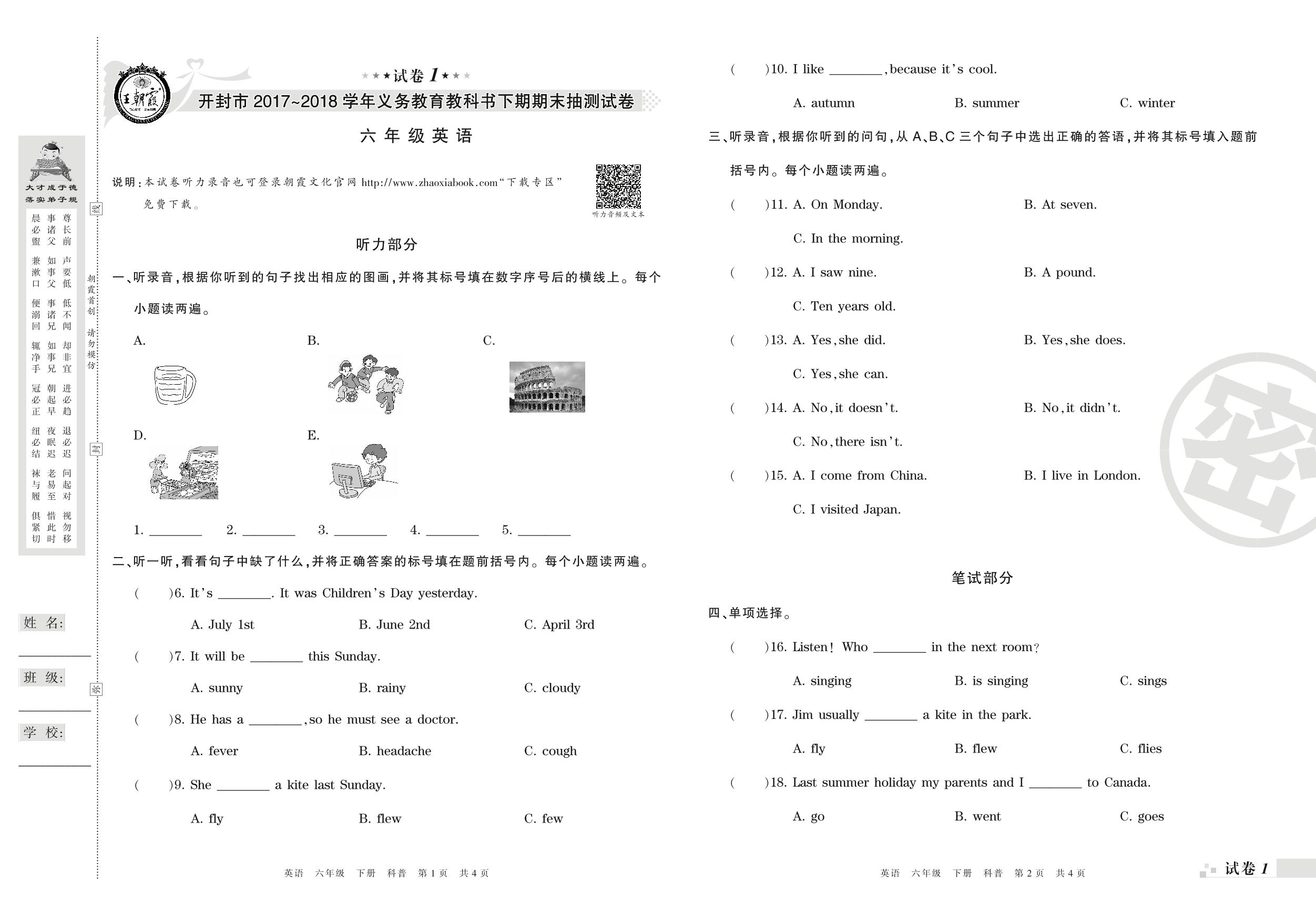2017-2018学年第二学期开封市六年级英语试卷(科普版)_R210807165426【1】