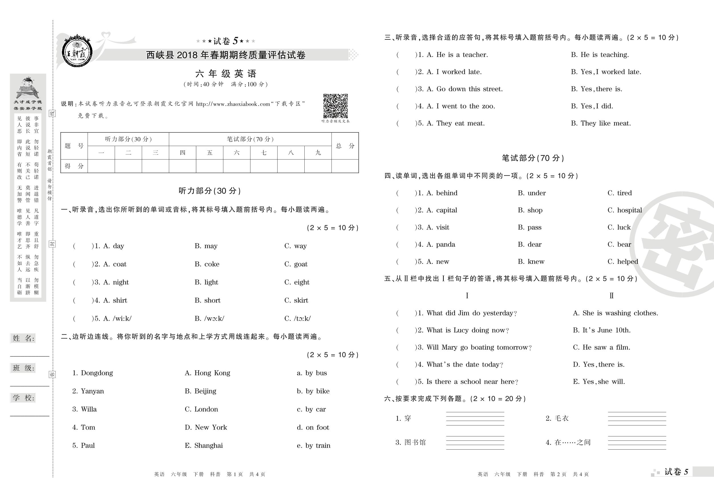 2017-2018学年第二学期南阳市西峡县六年级英语试卷(科普版)【5】