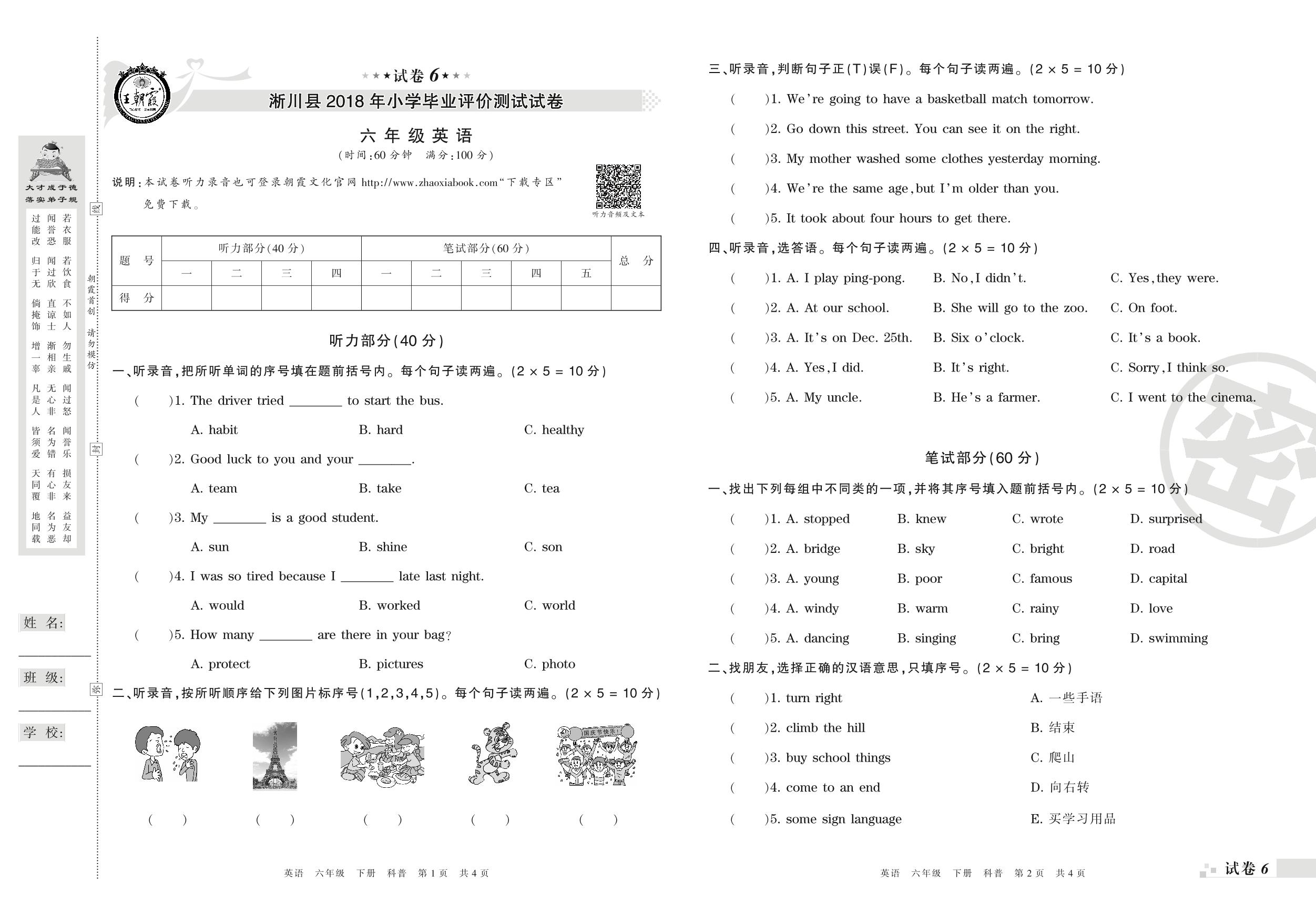 2017-2018学年第二学期南阳市淅川县六年级英语试卷(科普版)【6】