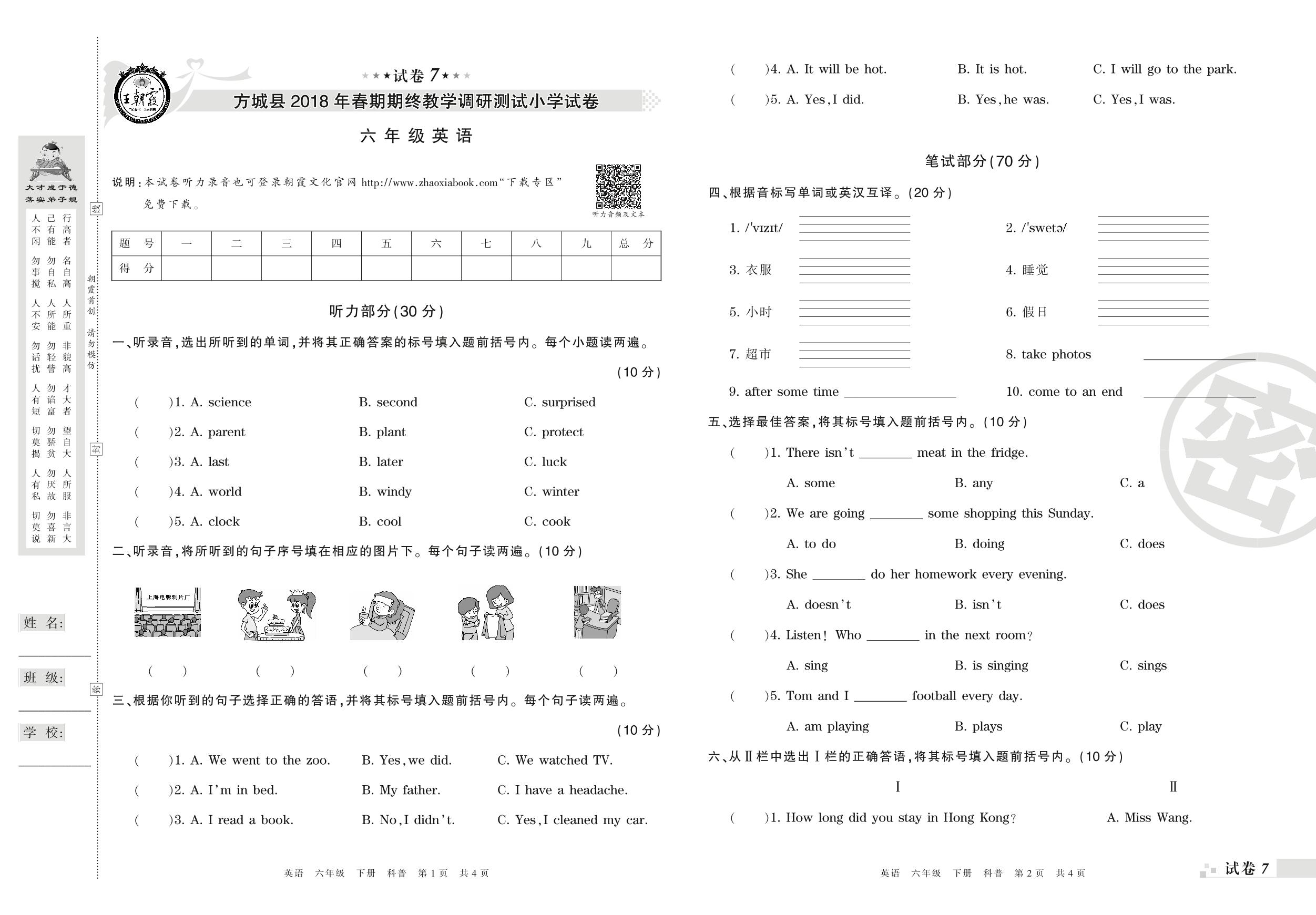 2017-2018学年第二学期南阳市方城县六年级英语试卷(科普版)【7】