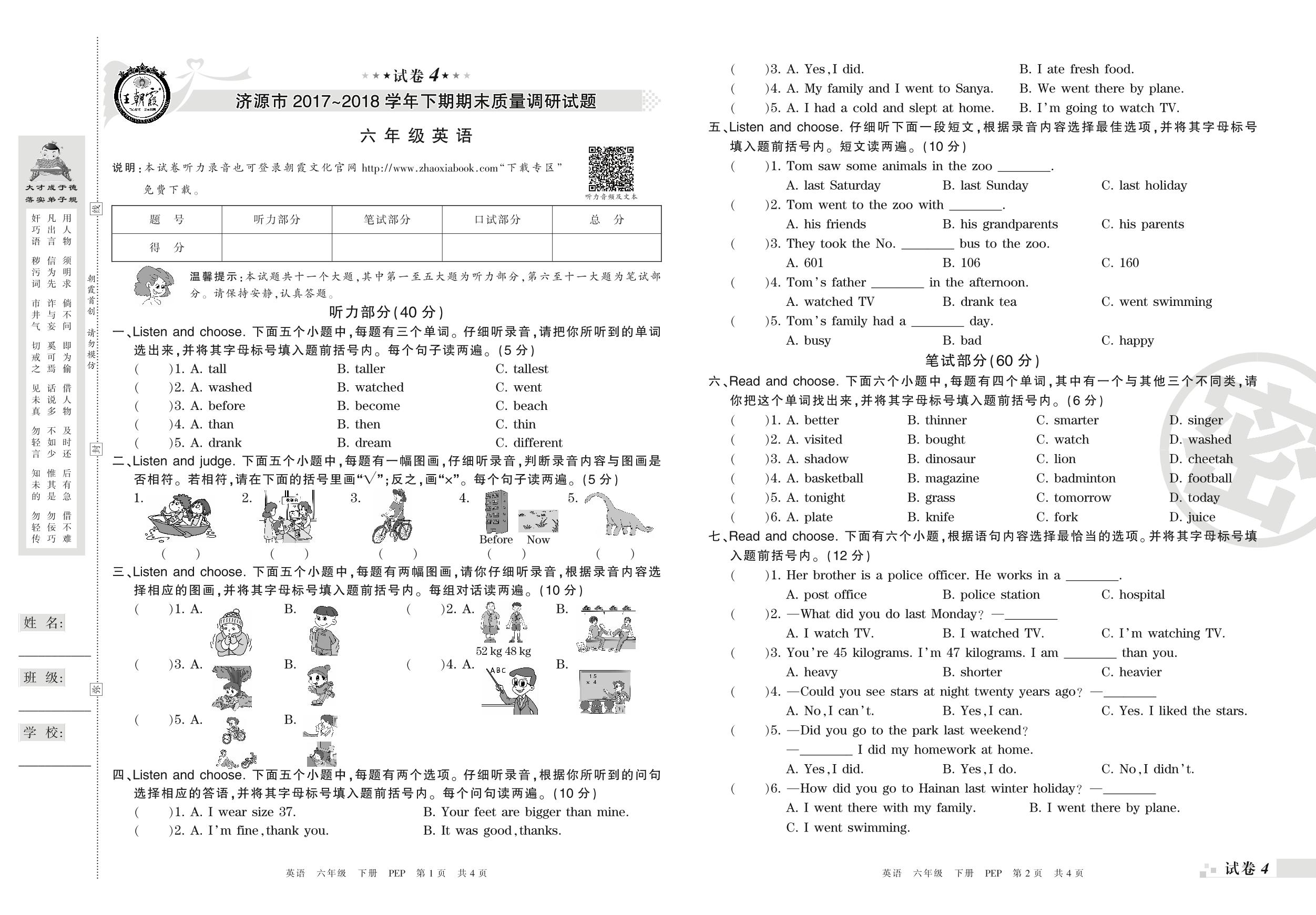 2017-2018学年第二学期济源市六年级英语试卷(PEP版)【4】