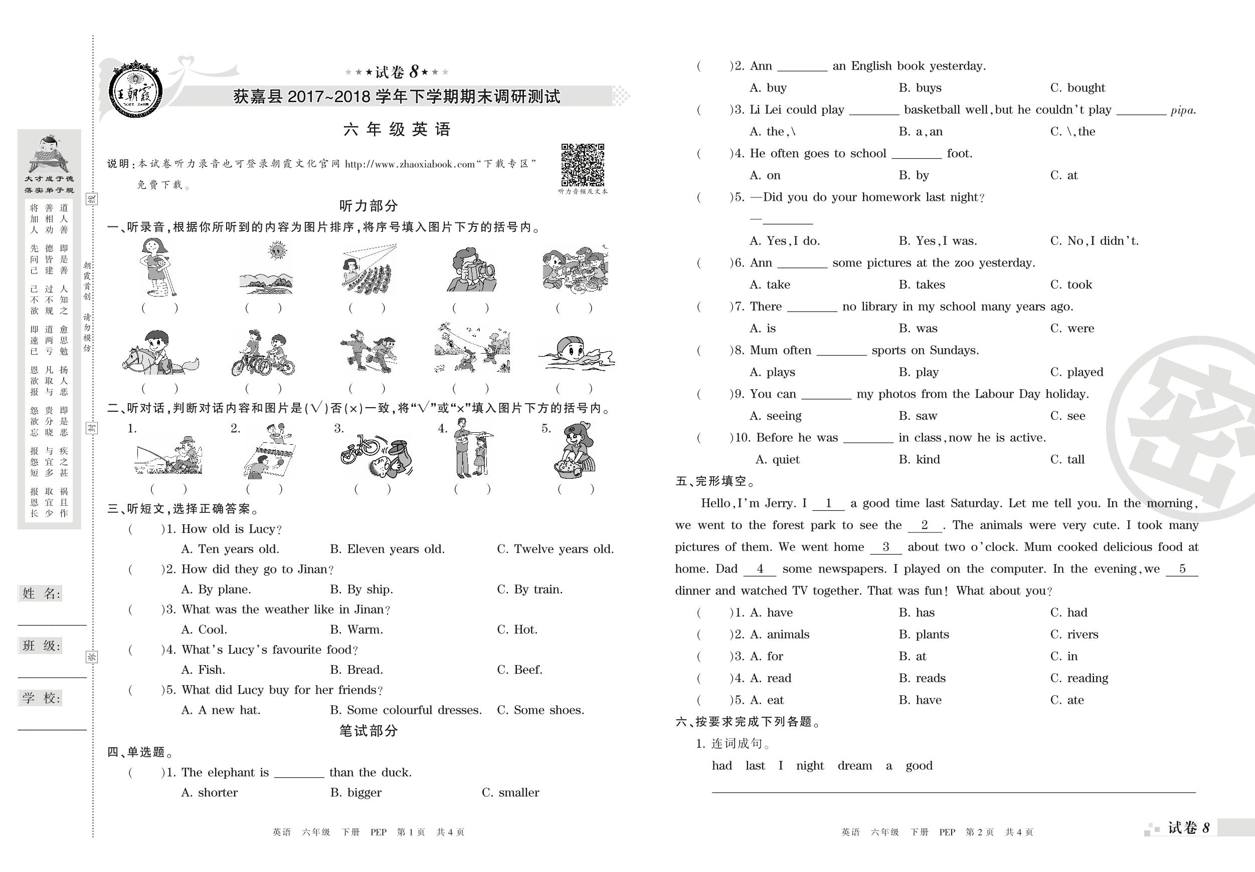 2017-2018学年第二学期新乡市获嘉县六年级英语试卷(PEP版)【8】