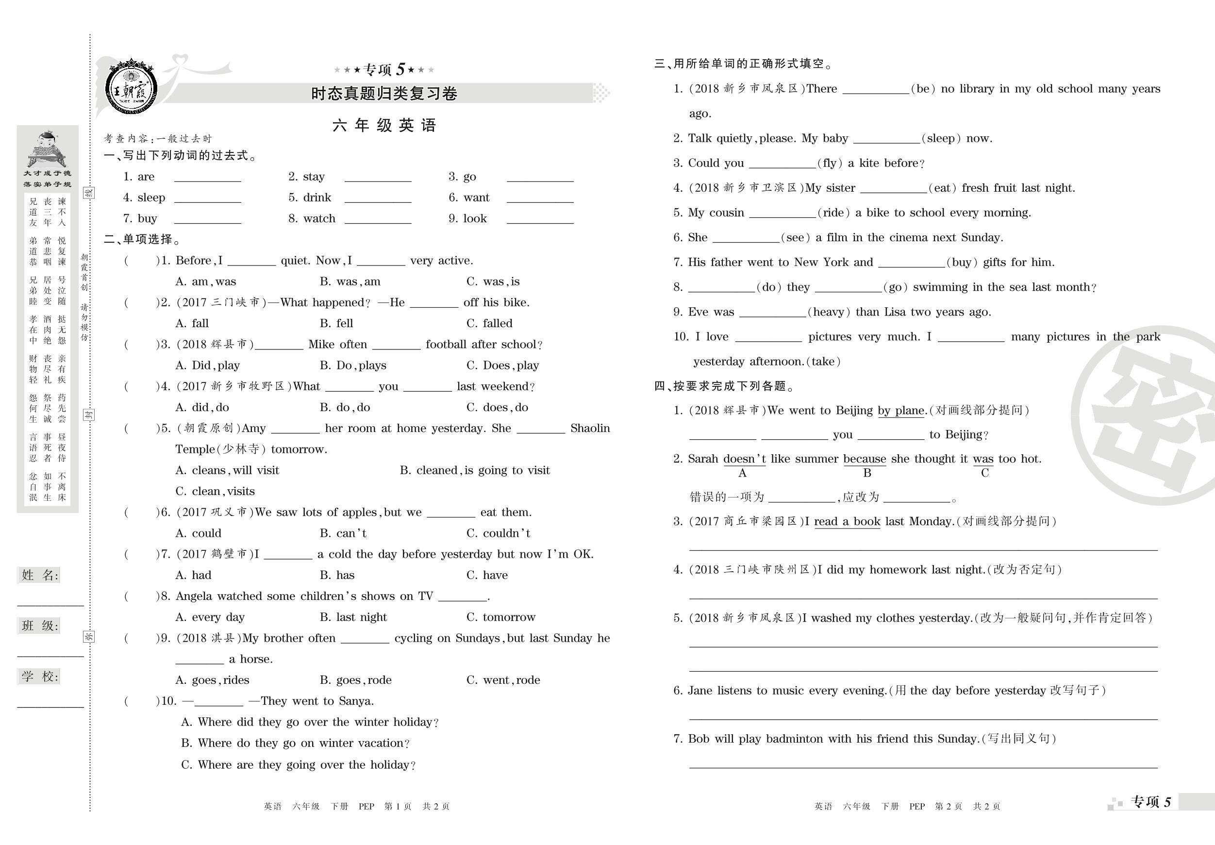 王朝霞期末专项卷——时态、情景交际真题归类复习卷六年级下册英语(PEP版)_R210807165540【0】