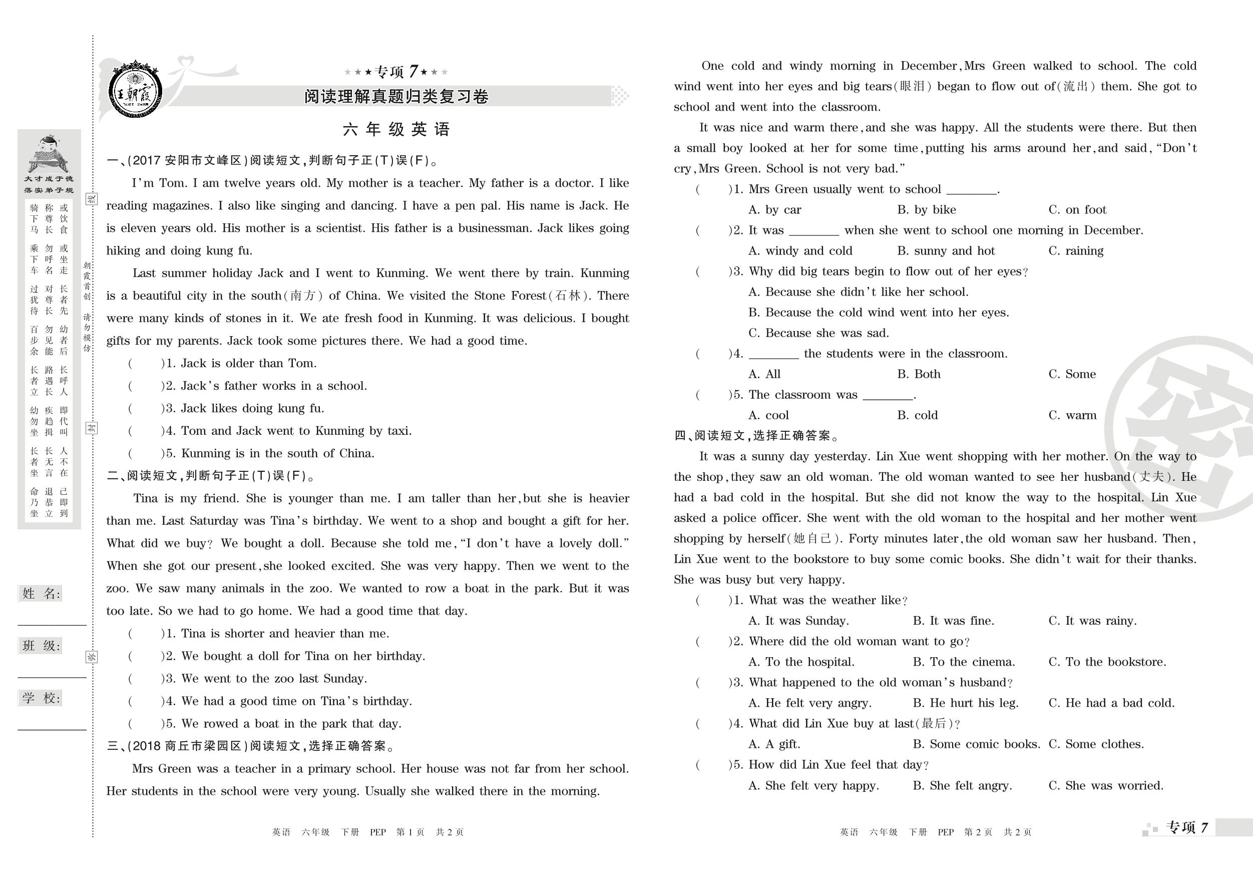 王朝霞期末专项卷——阅读理解、写作真题归类复习卷六年级下册英语(PEP版)_R210807165544【0】