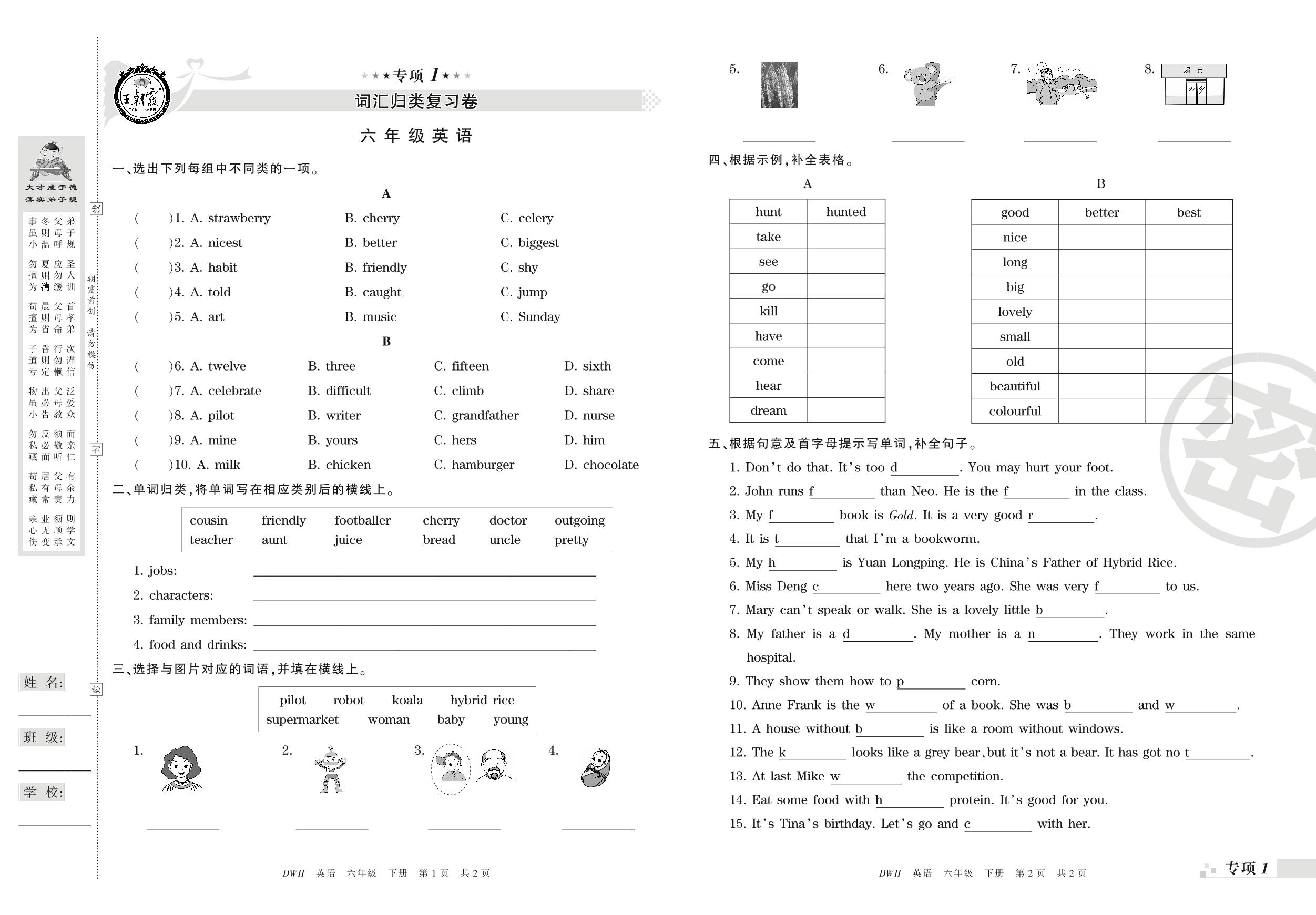 王朝霞期末专项卷——词汇、句子真题归类复习卷六年级下册英语(剑桥版)_R210807165607【0】