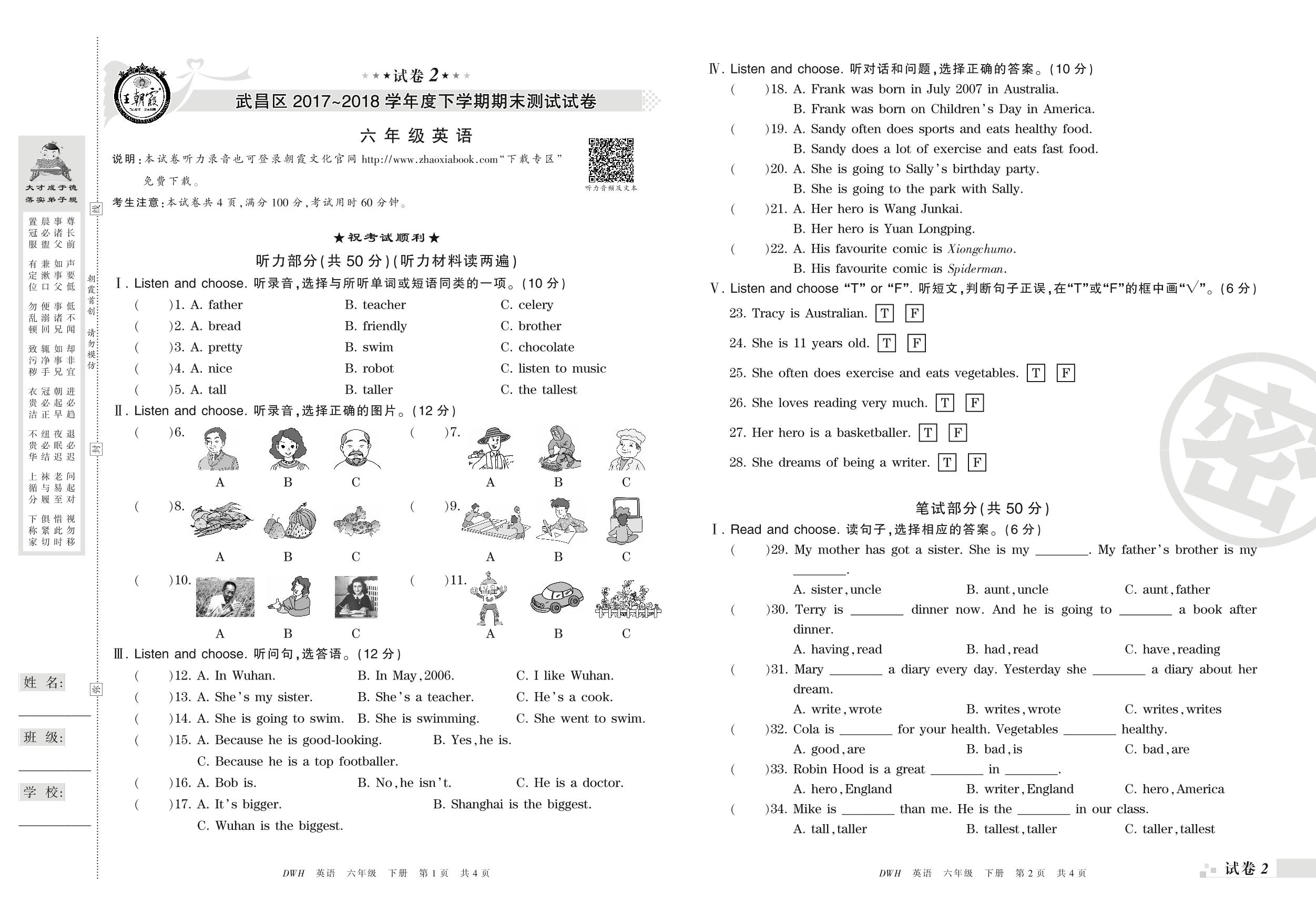 2017-2018学年第二学期武汉市武昌区六年级英语试卷(剑桥版)【2】