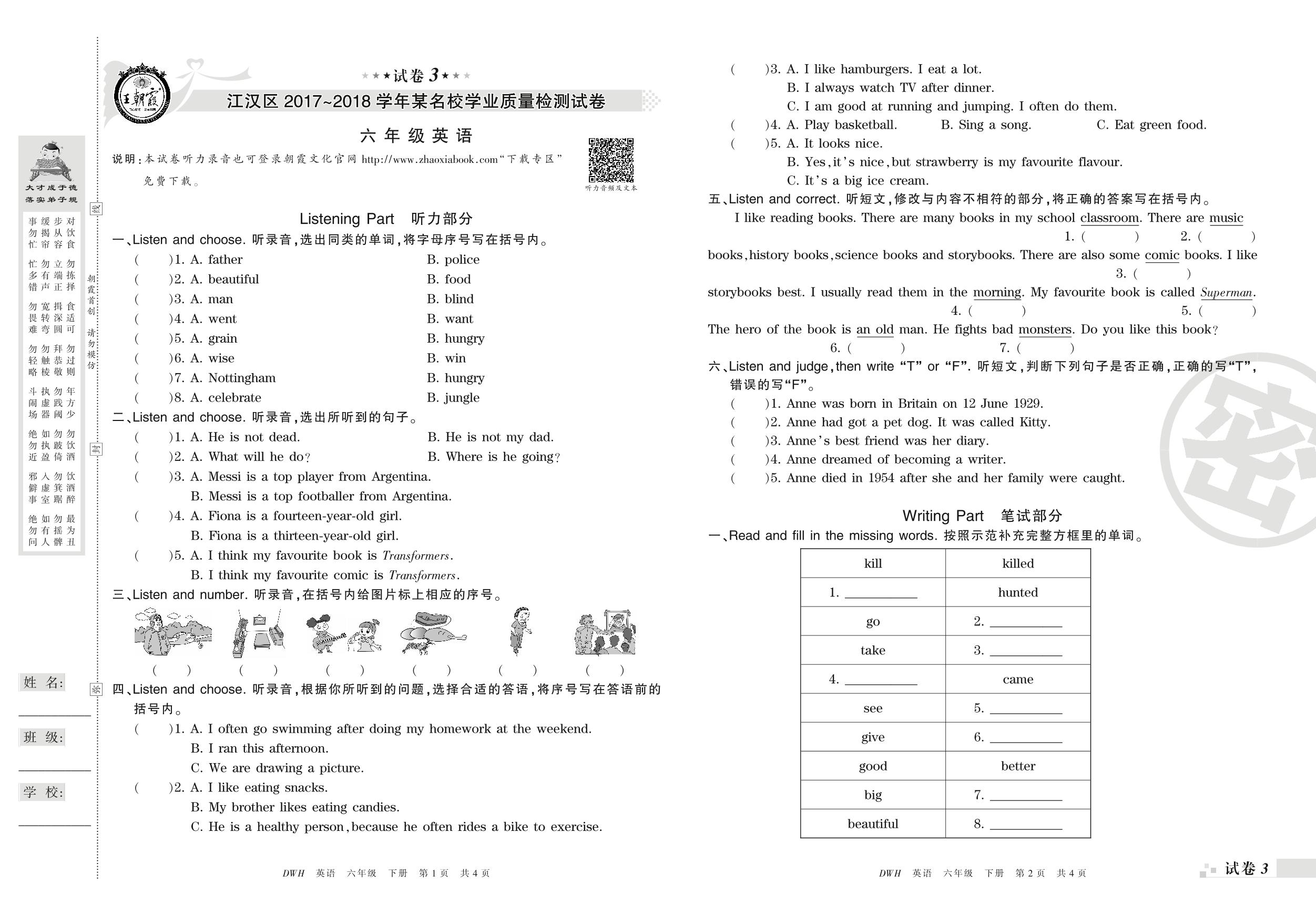 2017-2018学年第二学期武汉市江汉区六年级英语试卷(剑桥版)【3】