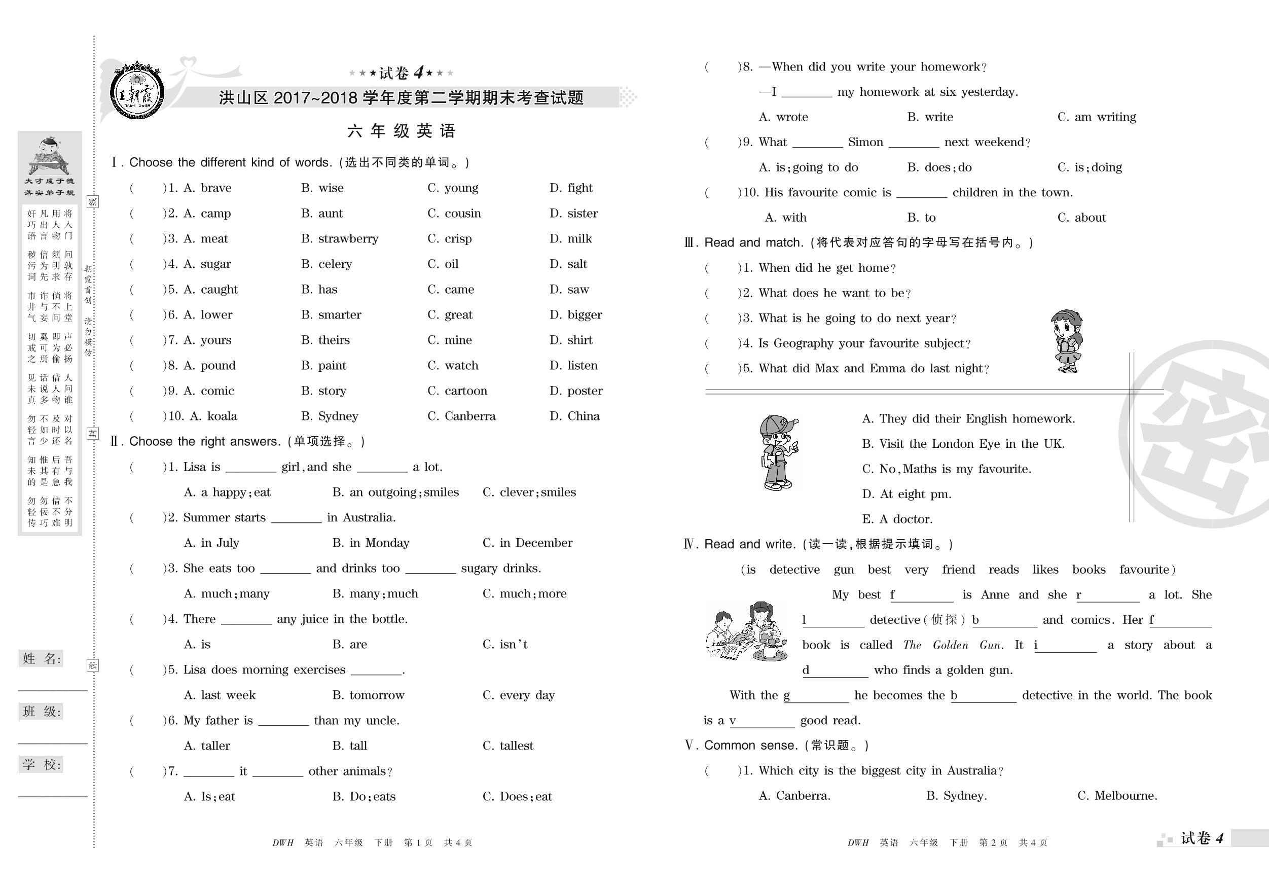 2017-2018学年第二学期武汉市洪山区六年级英语试卷(剑桥版)【4】