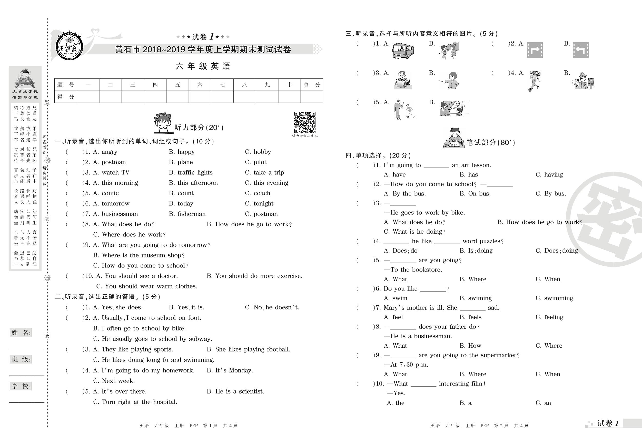 2018-2019学年第一学期黄石市六年级英语试卷(PEP版)【1】