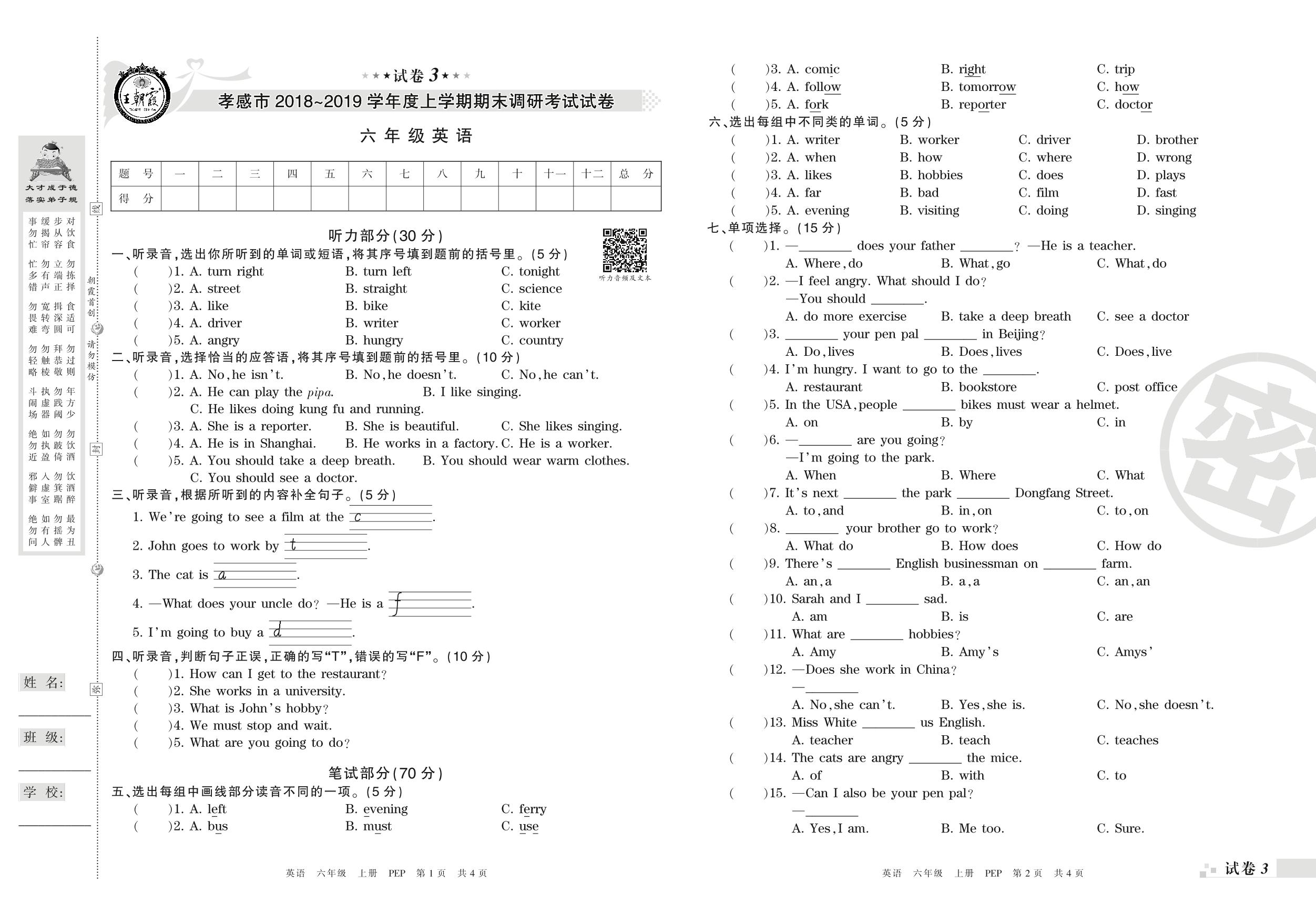 2018-2019学年第一学期孝感市六年级英语试卷(PEP版)【3】