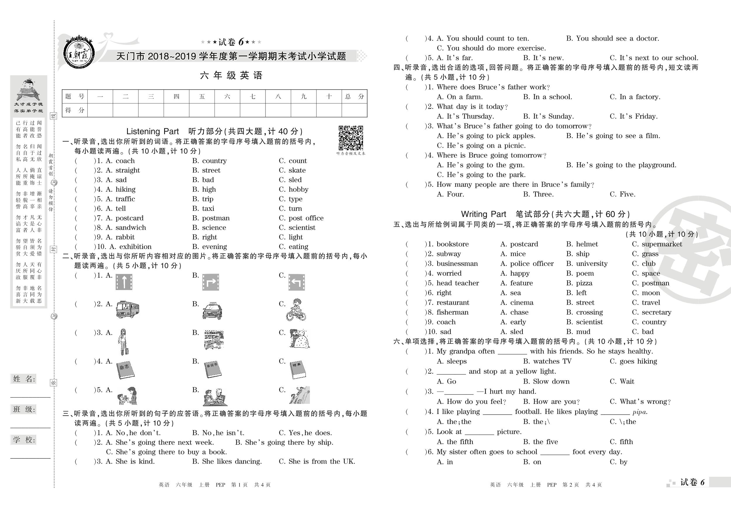 2018-2019学年第一学期天门市六年级英语试卷(PEP版)【6】