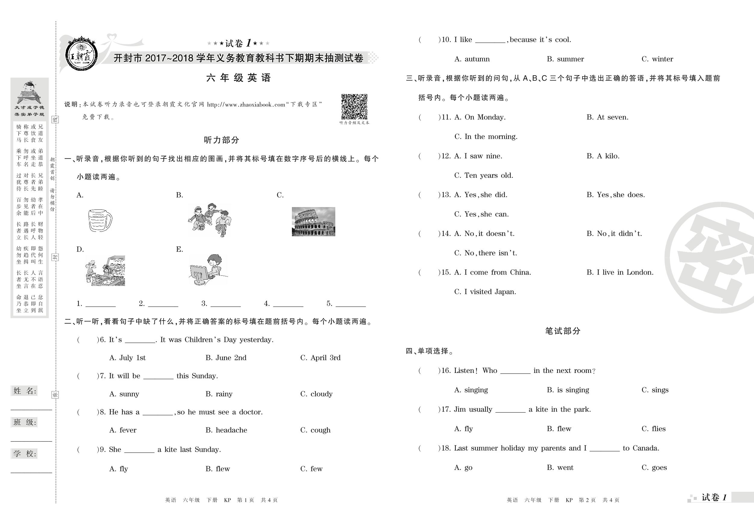2017-2018学年第二学期开封市六年级英语试卷(科普版)_R210807165750【1】