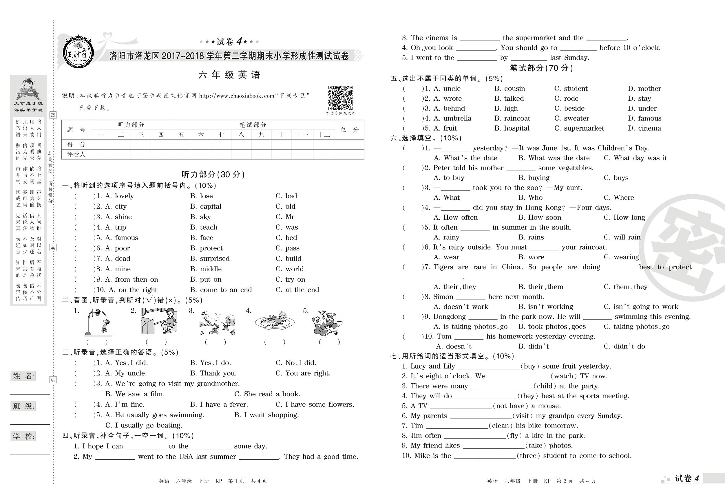 2017-2018学年第二学期洛阳市洛龙区六年级英语试卷(科普版)【4】