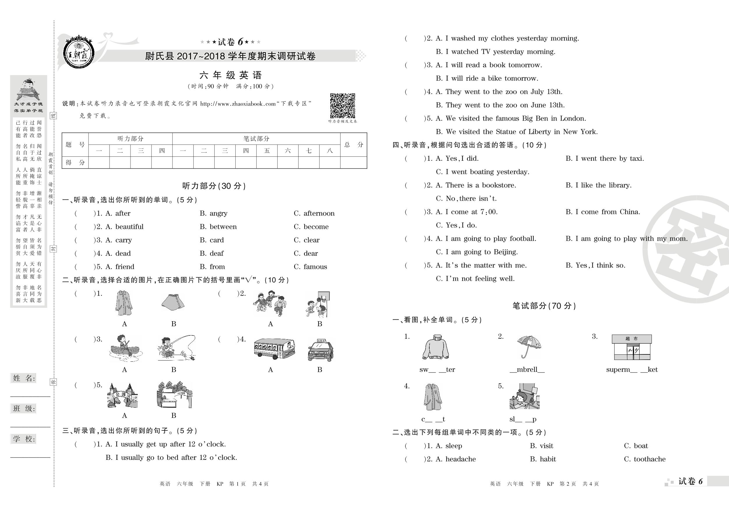 2017-2018学年第二学期开封市尉氏县六年级英语试卷(科普版)【6】