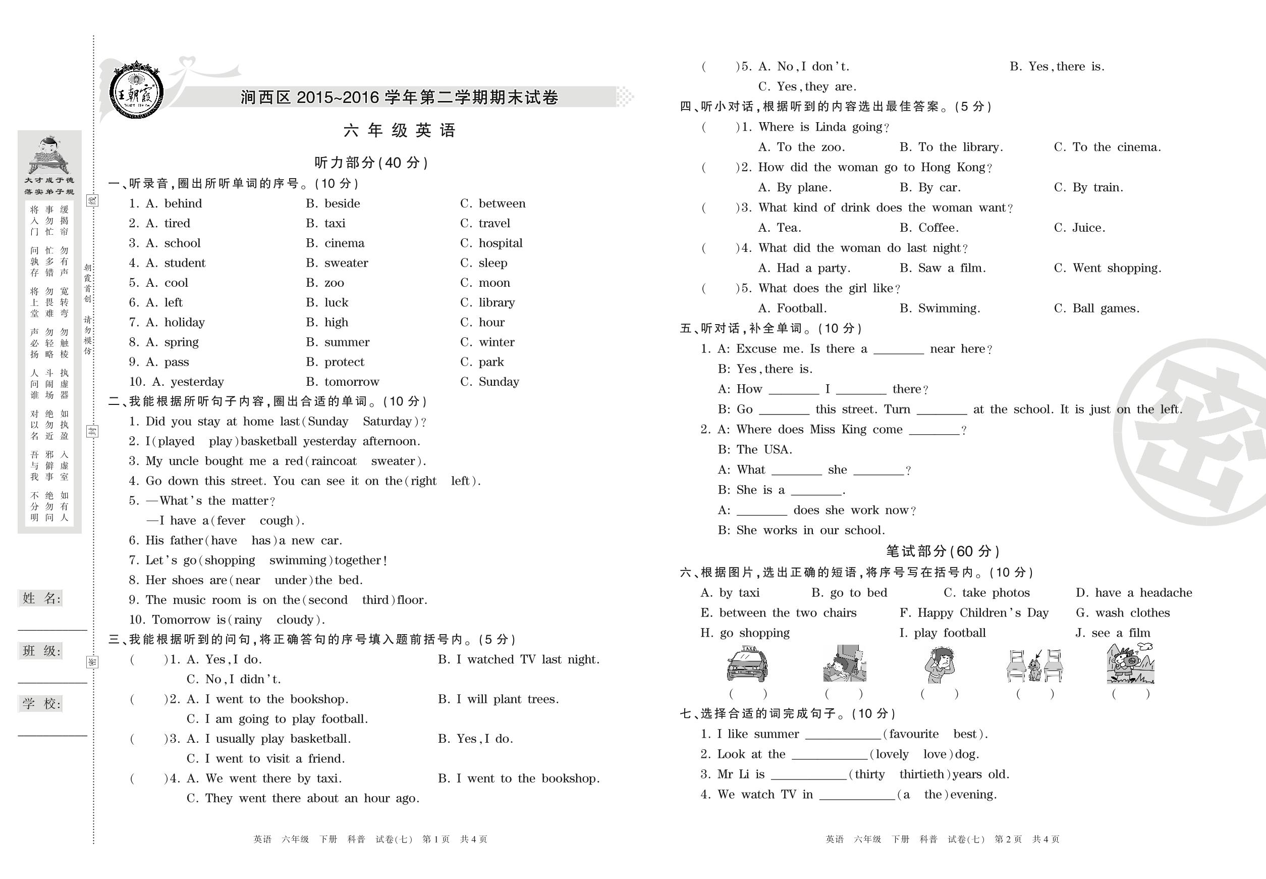 2015-2016学年第二学期洛阳市涧西区六年级英语试卷(科普版)【7】
