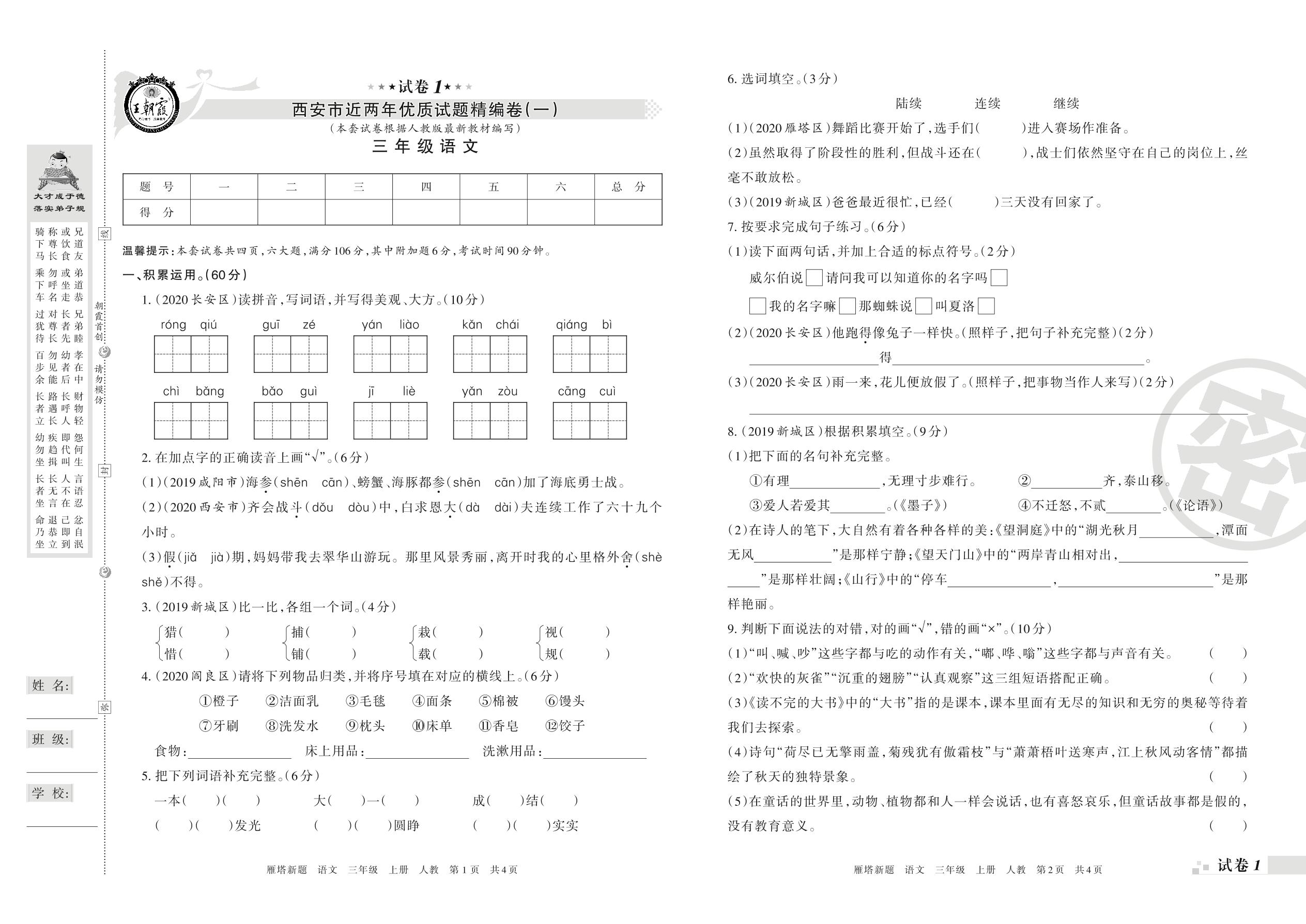 西安市近两年优质试题精编卷(一)三年级上册语文(人教版)【1】