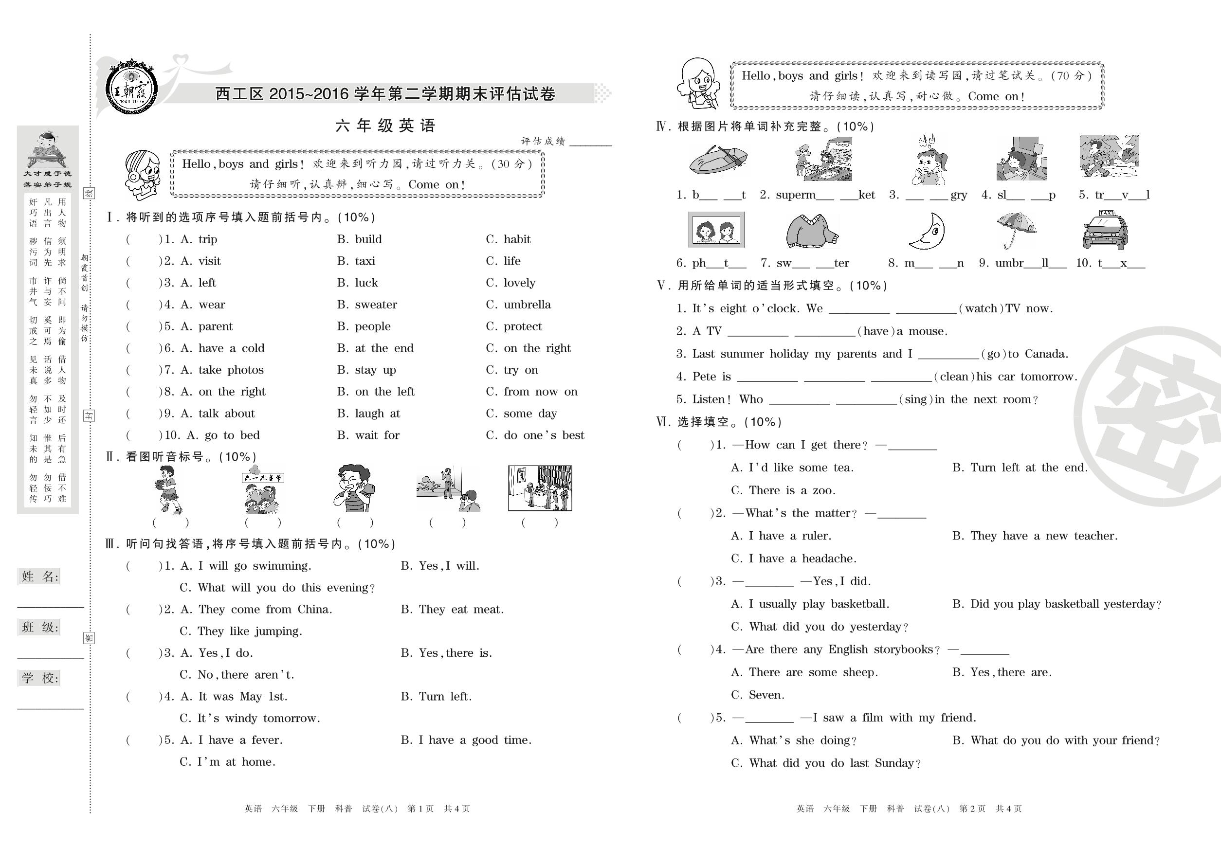 2015-2016学年第二学期洛阳市西工区六年级英语试卷(科普版)【8】